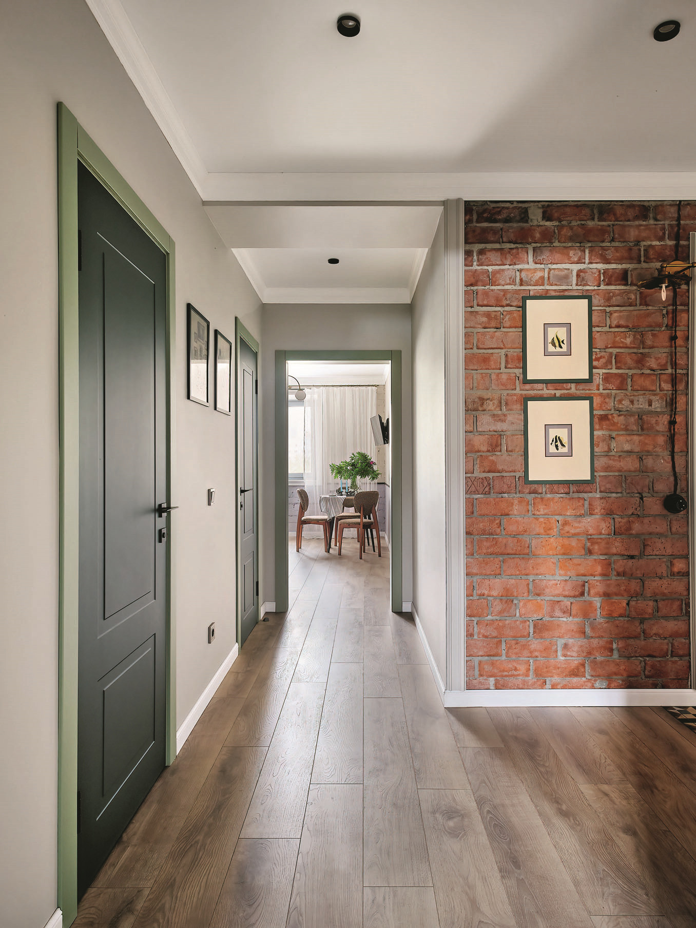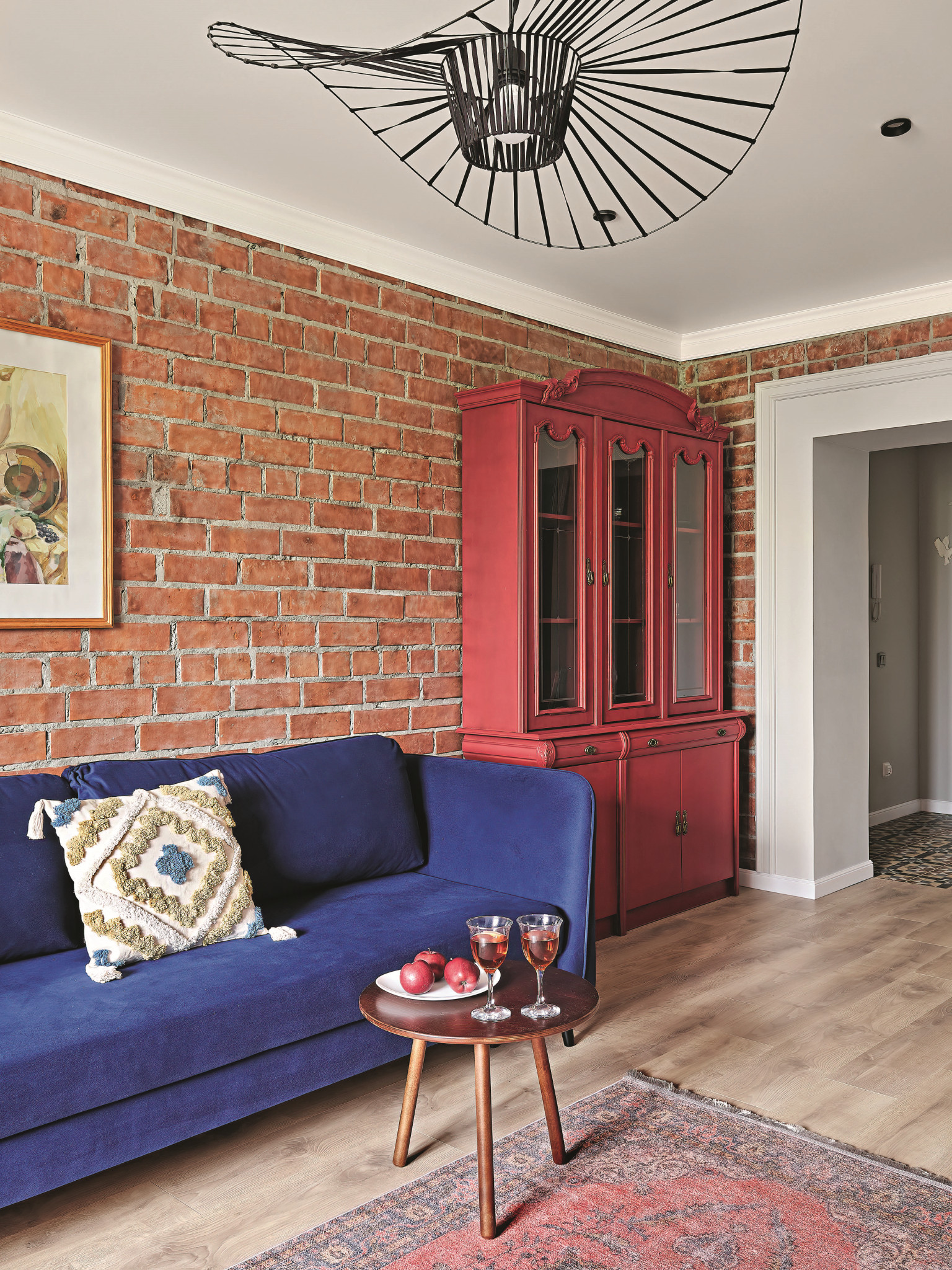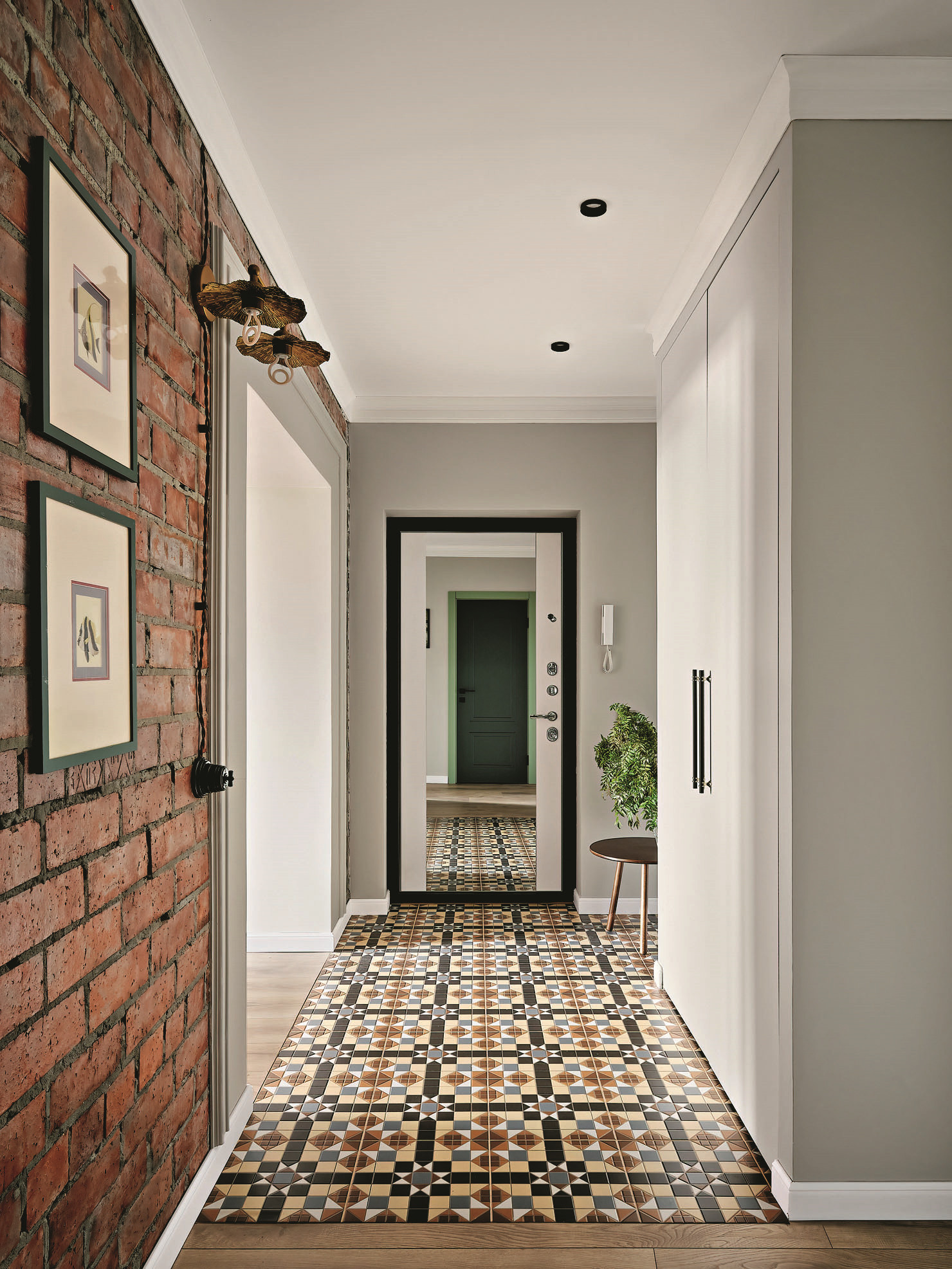 Ремонт. Запроектирован беспороговый стык напольных покрытий (влагостойкого ламината и керамогранита в зоне прихожей и санузлах). Из-за разной толщины напольных покрытий высоту пола нужно было вывести в один уровень, для чего залили новую стяжку. В гостиной и зоне прихожей решили сохранить существующую кирпичную кладку, её аккуратно зачистили и обеспылили, оставив натуральный цвет кирпича. Одна из стен гостиной оформлена декоративными молдингами, выкрашенными в цвет стены. Стены в кухне подготовили под покраску матовой влагостойкой краской светлого оттенка. Кстати, в кухне и спальне частично сохранили кирпичную кладку, но оформили в более нейтральном варианте — кирпич покрасили в цвет помещений. Матовый натяжной потолок обрамлён по периметру высоким полиуретановым потолочным карнизом. Чтобы максимально сохранить высоту помещения и при этом встроить точечные светильники