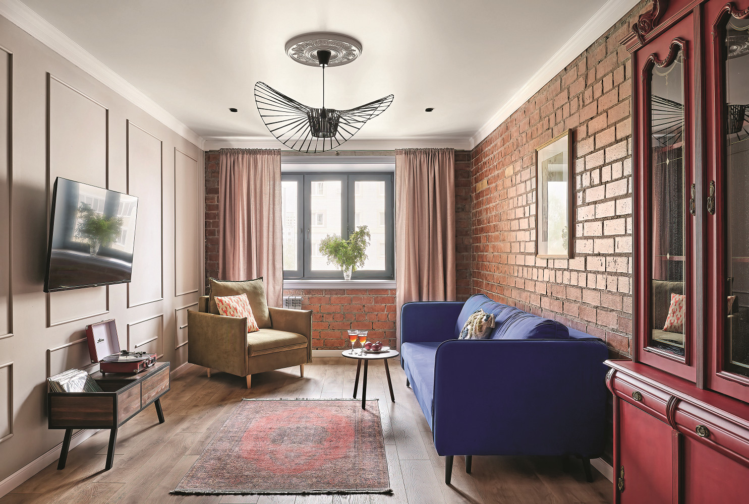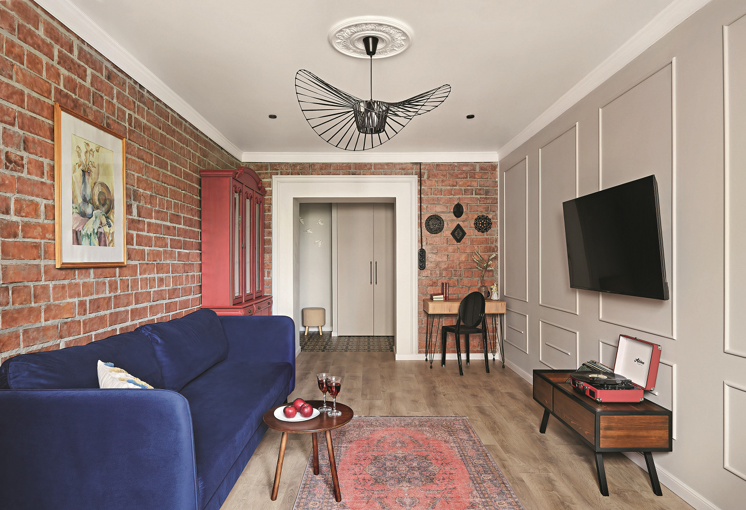 Стилистически в интерьере хотелось создать атмосферу питерских апартаментов: натуральный кирпич, молдинги, карнизы и розетки, сочетать современные и винтажные отделочные материалы и элементы.