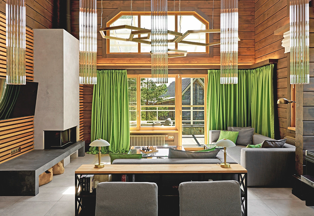 Хозяева попросили оформить пространство эффектно и при этом недорого, и такой подход нашёл отклик у дизайнеров — они вообще любители ярких, небанальных решений. Используя приём контраста и смелые цветовые сочетания, при небольшом бюджете удалось добиться вау-эффекта. (А вот пастельная палитра потребовала бы дорогого исполнения, и этот аспект авторы проекта тоже учитывали.) Так в интерьере появились тёмное дерево, отделка планкеном, современные геометричные формы светильников и текстиль насыщенного зелёного оттенка. Отделка стен тёмной краской решила ещё одну проблему: помогла скрыть сучковатое дерево неудачного розового оттенка. Для оформления интерьеров выбрали