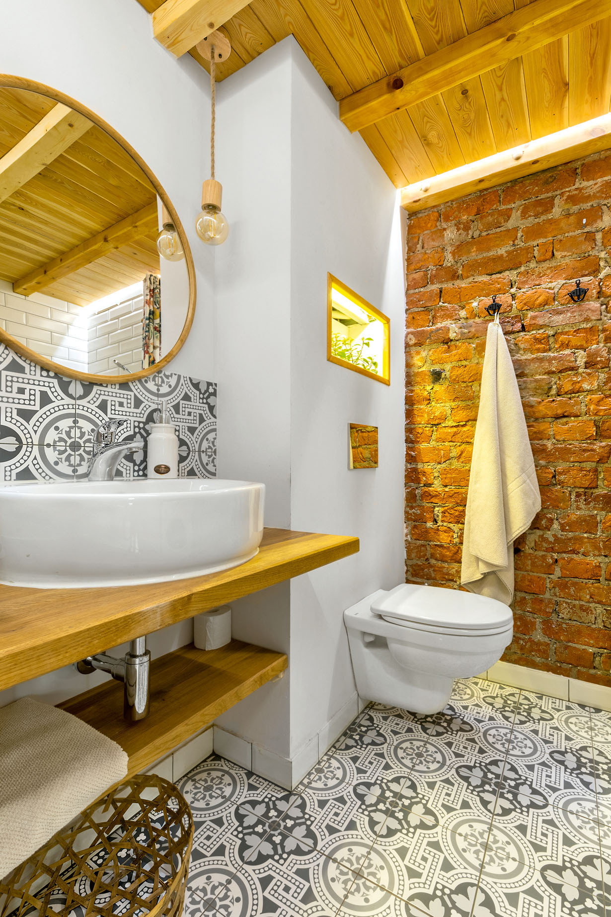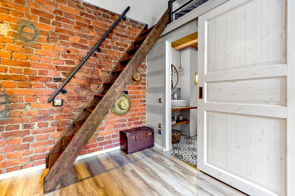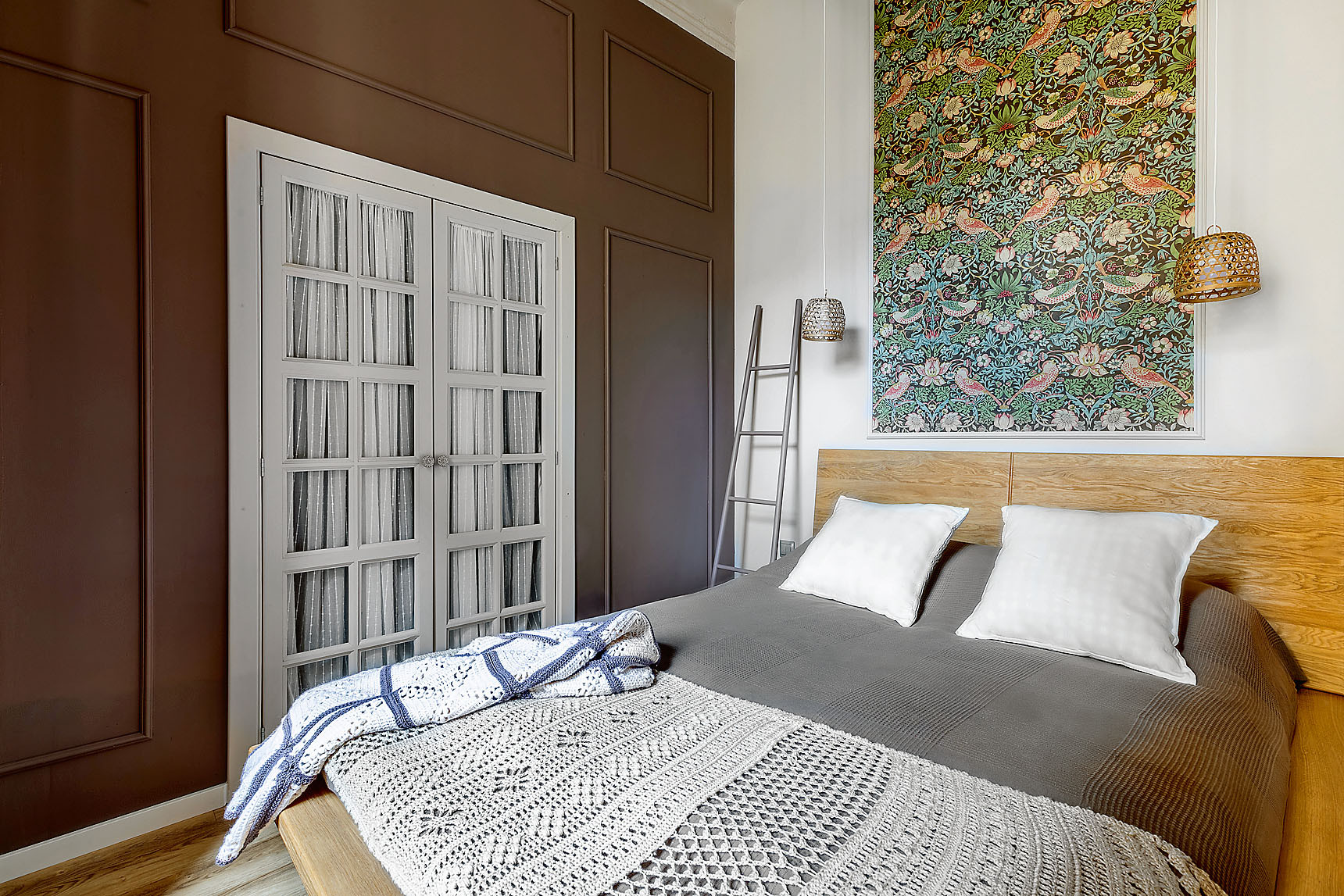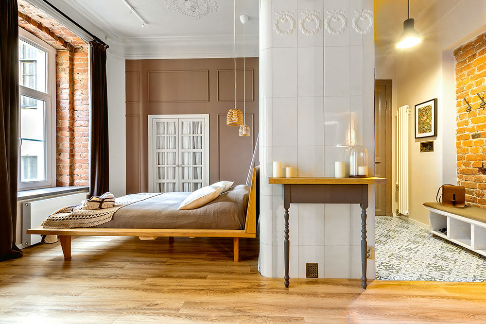 Авторы проекта постарались по максимуму сохранить следы исторического прошлого в квартире — например, оставили элегантный портал изразцовой печи в качестве декоративного элемента, а историческую кирпичную кладку в некоторых местах выставили напоказ, покрыв лаком. Грубоватая поверхность из кирпича весьма необычно смотрится на оконных откосах и кухонном фартуке. Удалось сохранить и высоту потолков (3,4 м), а также отреставрировать вековую лепнину, удалив с неё несколько слоёв масляной краски. Интересен и тот факт, что большую часть деревянной мебели хозяин изготовил собственными руками: смастерил обеденный стол и кровать из массива дуба, обувницу при входе, консоль и даже кухонные фасады.
