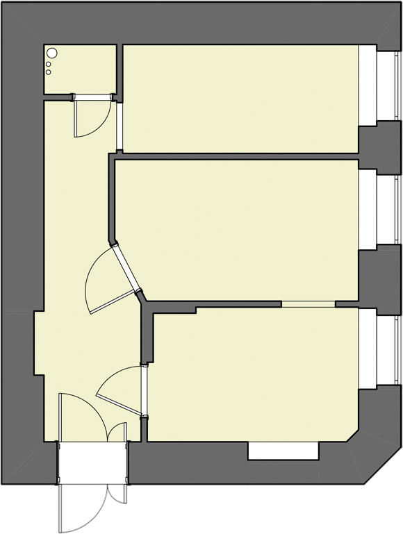Хозяева приобрели квартиру на улице Рубинштейна (самом тусовочном месте Санкт-Петербурга) не для себя, а для приёма гостей города. Она расположена на третьем этаже дома постройки 1914 г. и имеет непростую историю: после революции крошечную квартиру площадью всего 32,4 м2 превратили в двухкомнатную коммуналку с ванной в кухне; она пережила множество владельцев, но редко ремонтировалась. Перед специалистами стояла задача преобразить «убитую» более чем вековой эксплуатацией недвижимость в уютный интерьер, да так, чтобы арендаторы чувствовали себя здесь как дома, а не в гостинице.