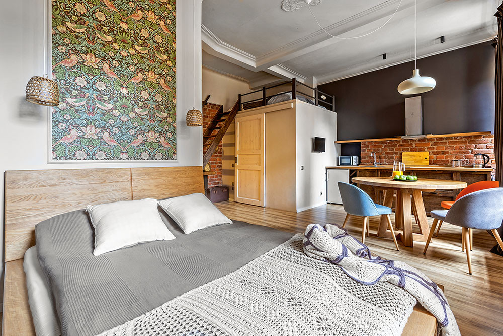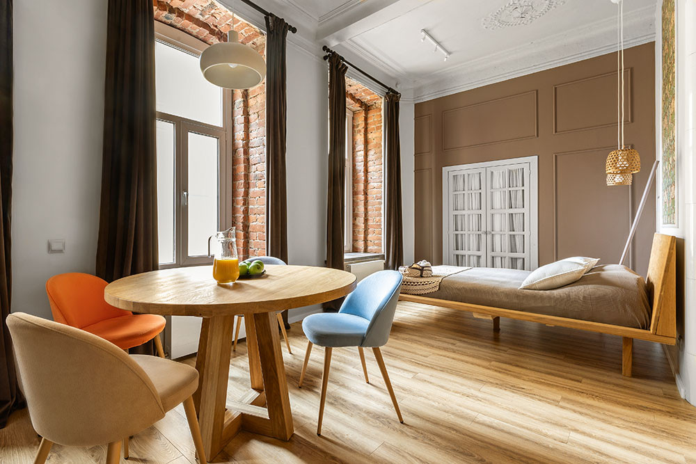 Компактная площадь этой квартиры в Санкт-Петербурге не помешала авторам проекта создать удобный и функциональный интерьер для сдачи в аренду, при этом не тесный, легко трансформируемый и бережно сохранивший следы вековой истории