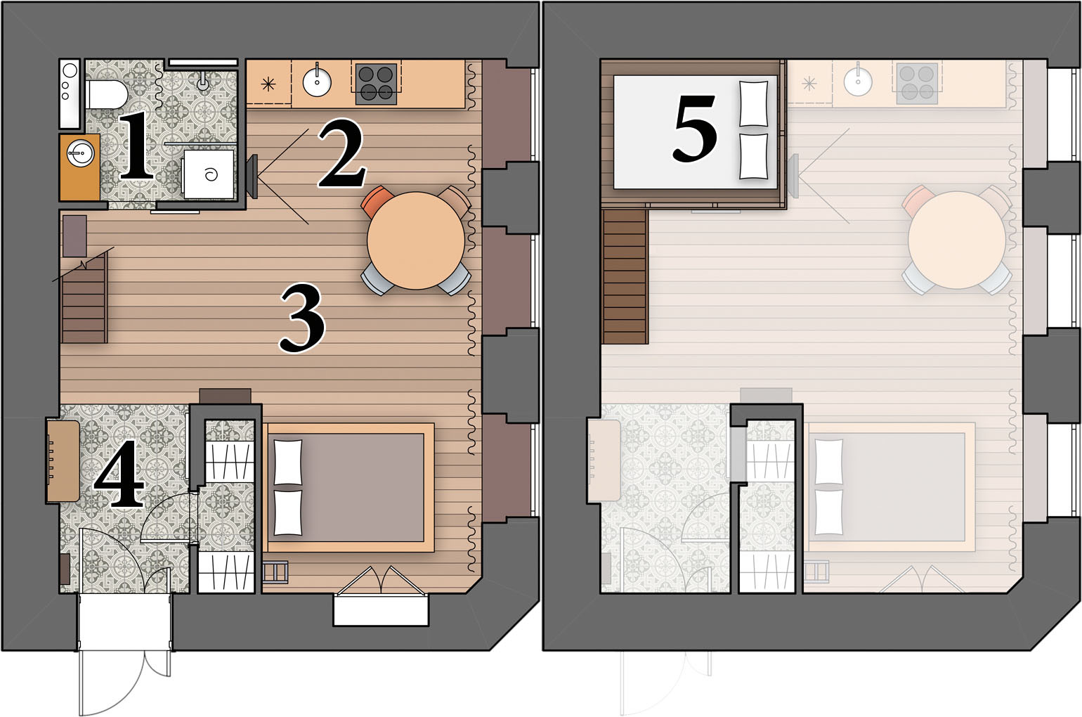 Перепланировка. В прямоугольной в плане квартире с тремя окнами, выходящими в классический питерский двор-колодец, не было внутренних несущих стен. Поэтому все перегородки решено было демонтировать. На маленькой площади необходимо было разместить несколько спальных мест, обеденную зону, полноценную кухню и продумать хранение вещей. Чтобы реализовать все пожелания хозяев, авторам проекта пришлось пойти на уловки: поднять одну зону для сна на второй уровень, разместив спальное место на антресоли над ванной комнатой. Ещё одним интересным дизайнерским решением стала организация гардеробной в пространстве за порталом камина. Для этого примыкающую к нему перегородку продлили до противоположной стены, образовав нишу, а дверное полотно установили со стороны прихожей. Таким образом удалось отделить второе спальное место от входной зоны.
