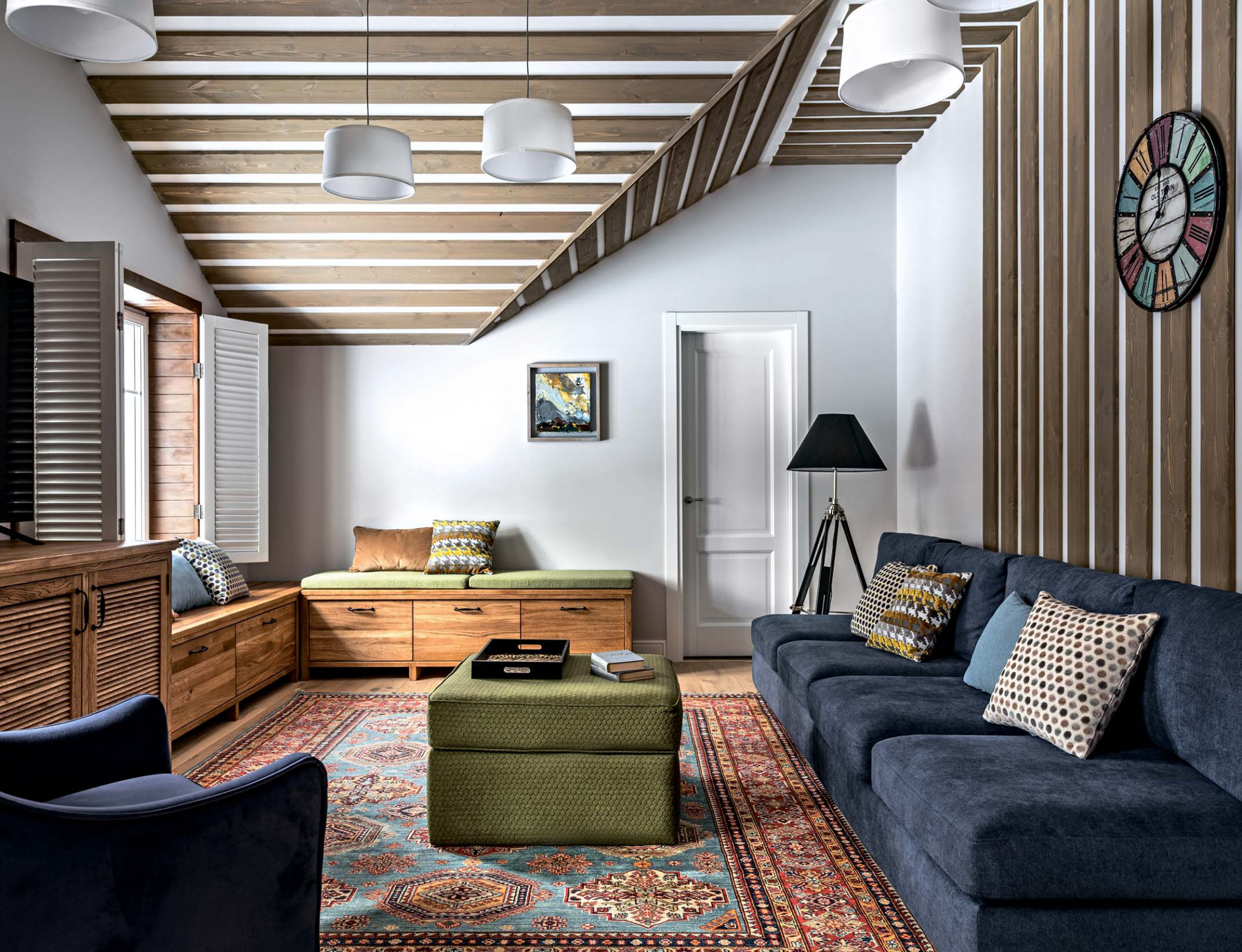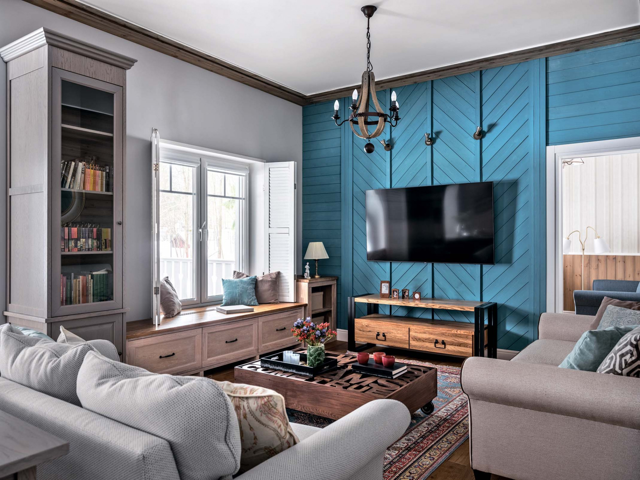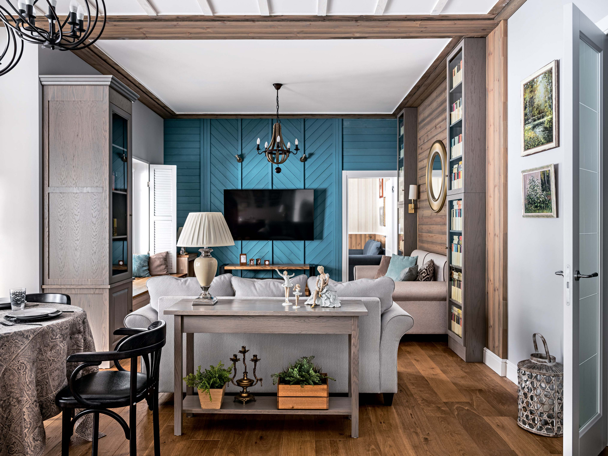 Паркетная доска, обшивка стен, потолочные панели и балки — тон во внутренней отделке дома задаёт дерево. Производимое им впечатление определяют порода и способ обработки поверхности: лакировка, искусственное старение, окрашивание, как, например, на стене гостиной, где необычный геометрический рисунок образует микс маленьких бирюзовых планок. Присутствие внушительных объёмов дерева весьма кстати в интерьерах, оформленных в стародачном стиле. Это прекрасный фон для картин, предметов декора, светильников и антикварных вещей. Не менее важен практический аспект использования деревянных панелей. Материал даёт дополнительную звуко- и теплоизоляцию и без особого трудоёмкого ухода прослужит десятки лет.