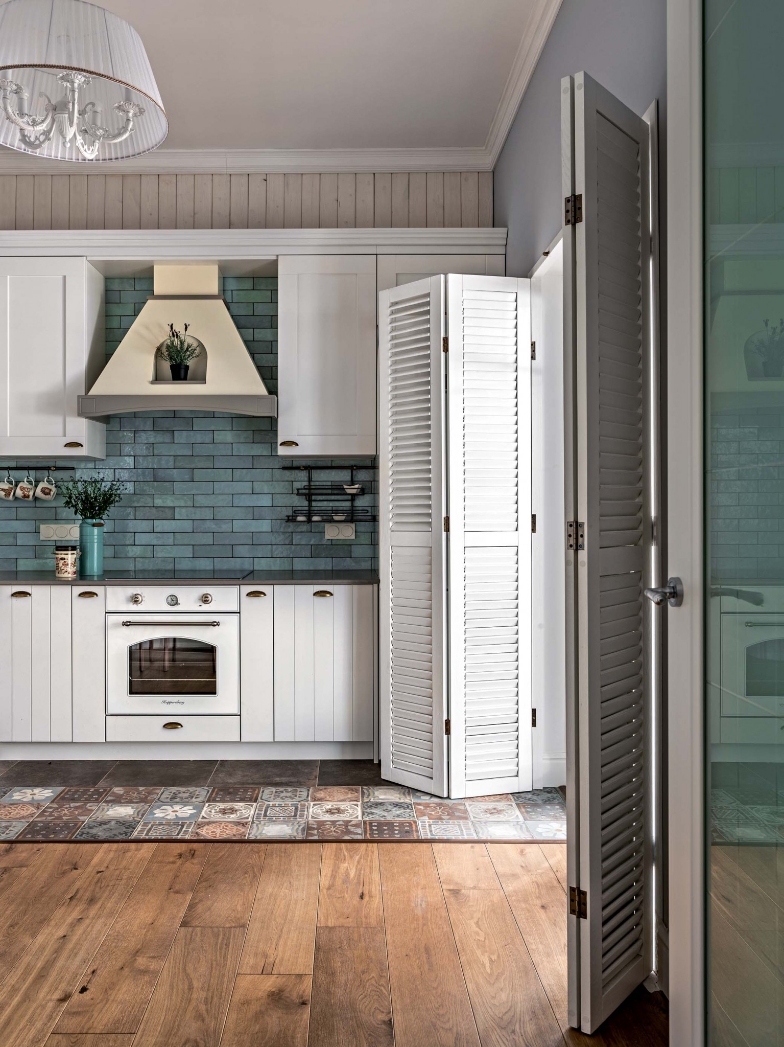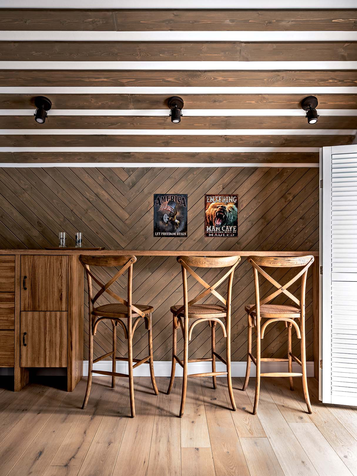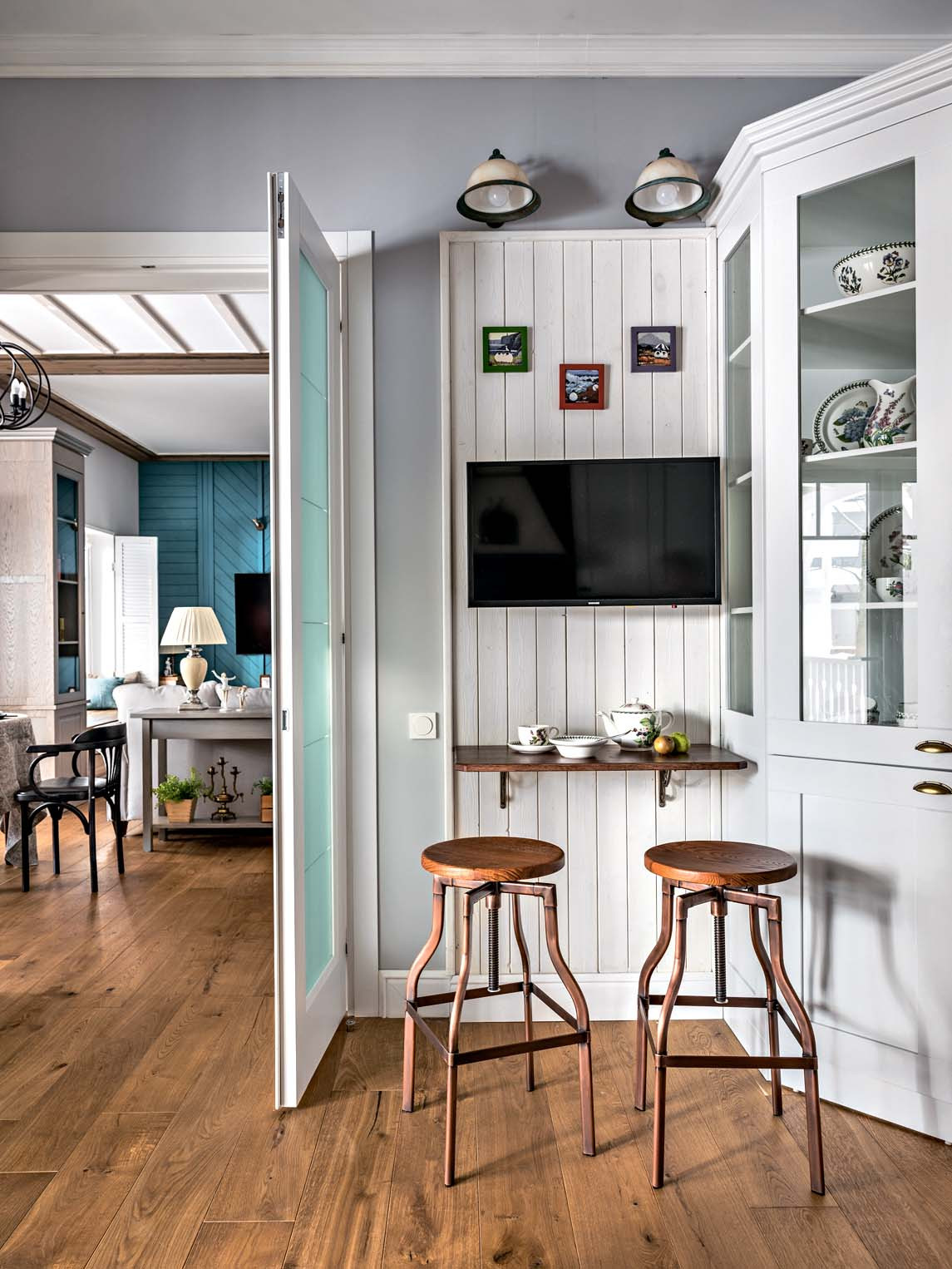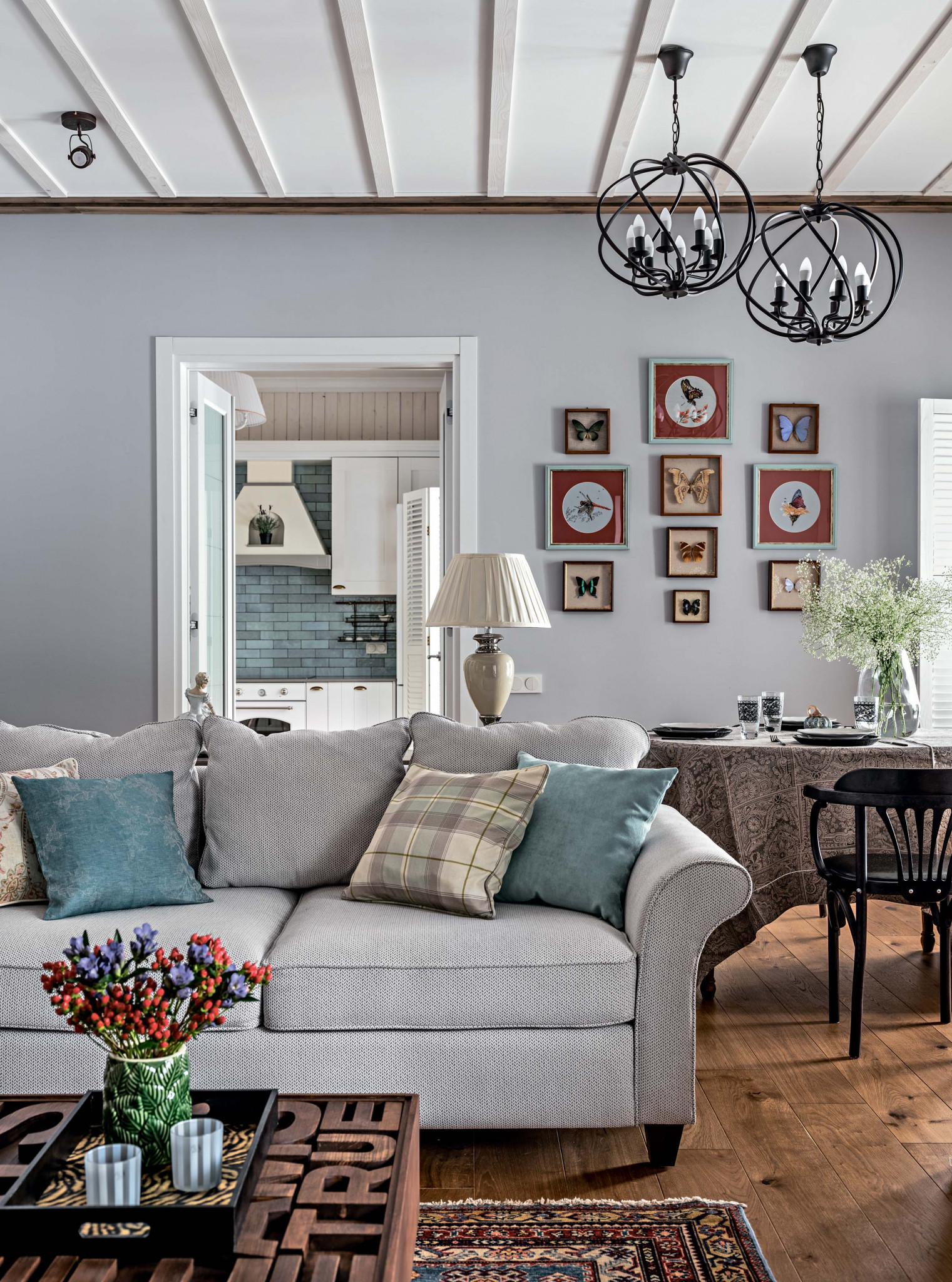 Паркетная доска, обшивка стен, потолочные панели и балки — тон во внутренней отделке дома задаёт дерево. Производимое им впечатление определяют порода и способ обработки поверхности: лакировка, искусственное старение, окрашивание, как, например, на стене гостиной, где необычный геометрический рисунок образует микс маленьких бирюзовых планок. Присутствие внушительных объёмов дерева весьма кстати в интерьерах, оформленных в стародачном стиле. Это прекрасный фон для картин, предметов декора, светильников и антикварных вещей. Не менее важен практический аспект использования деревянных панелей. Материал даёт дополнительную звуко- и теплоизоляцию и без особого трудоёмкого ухода прослужит десятки лет.