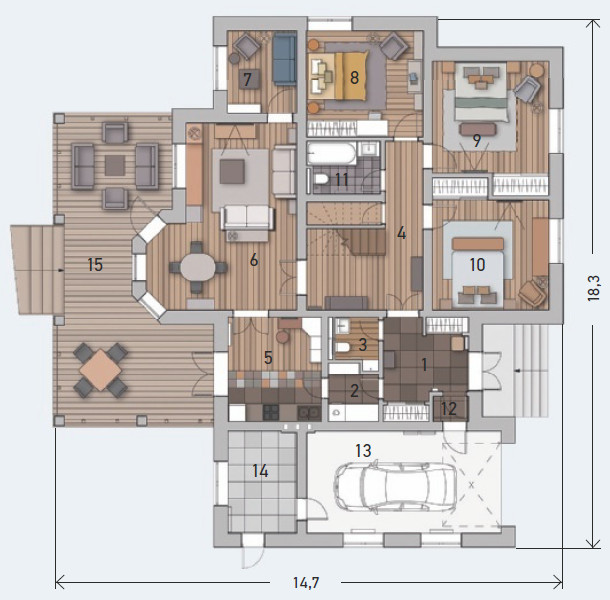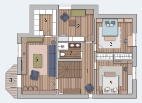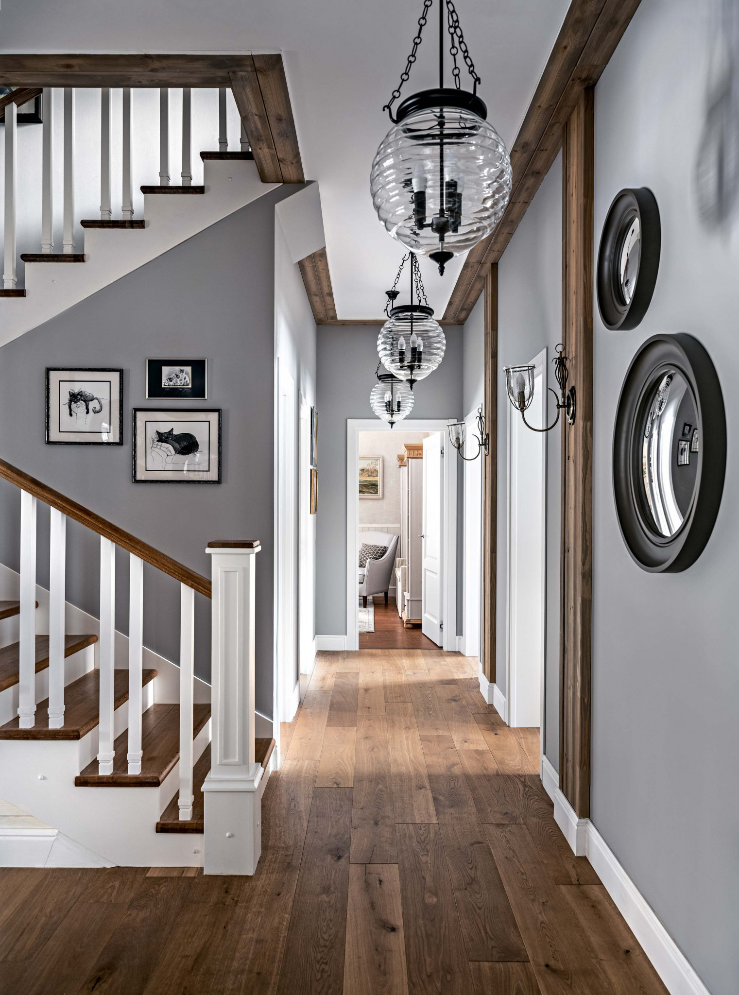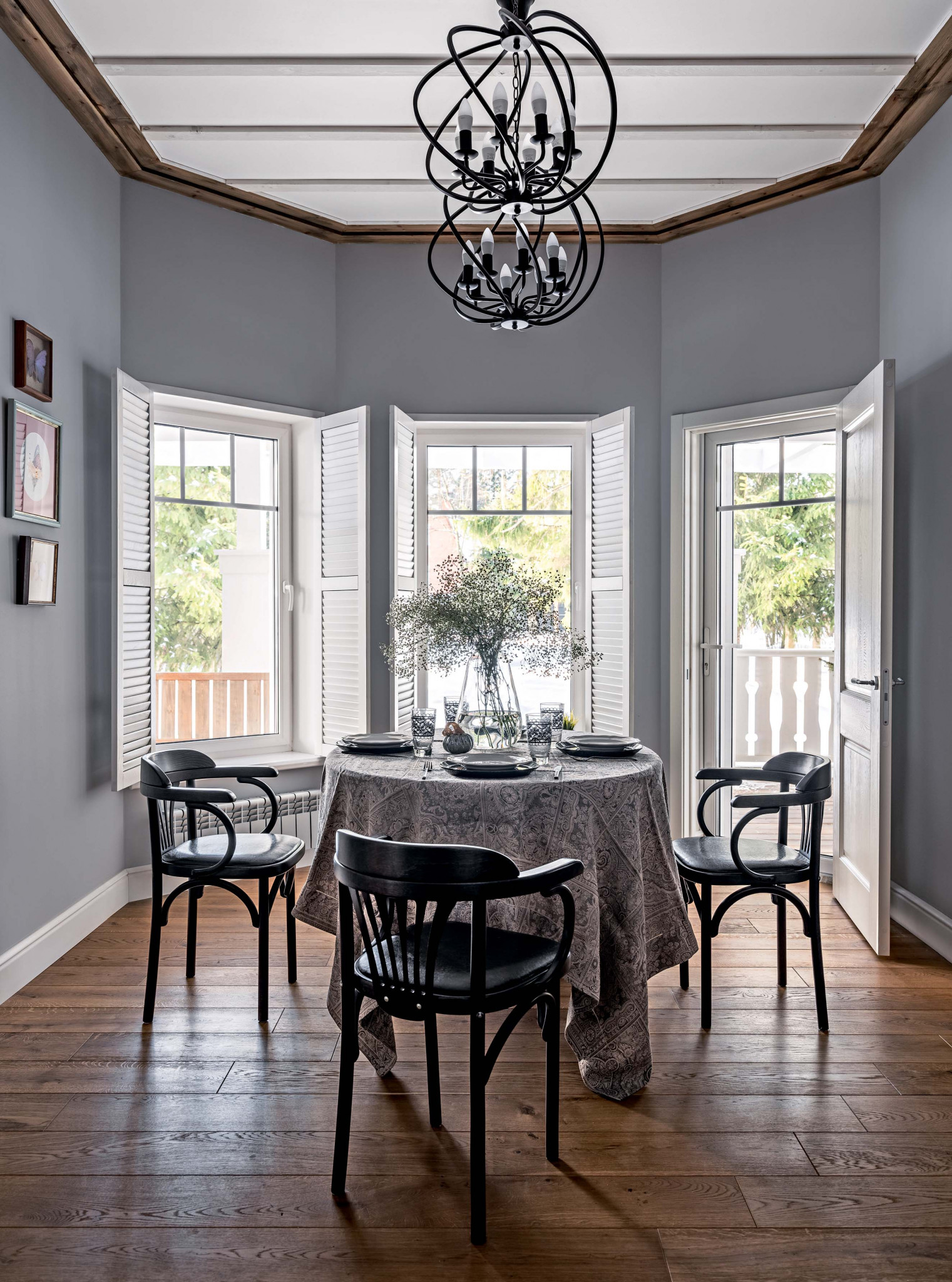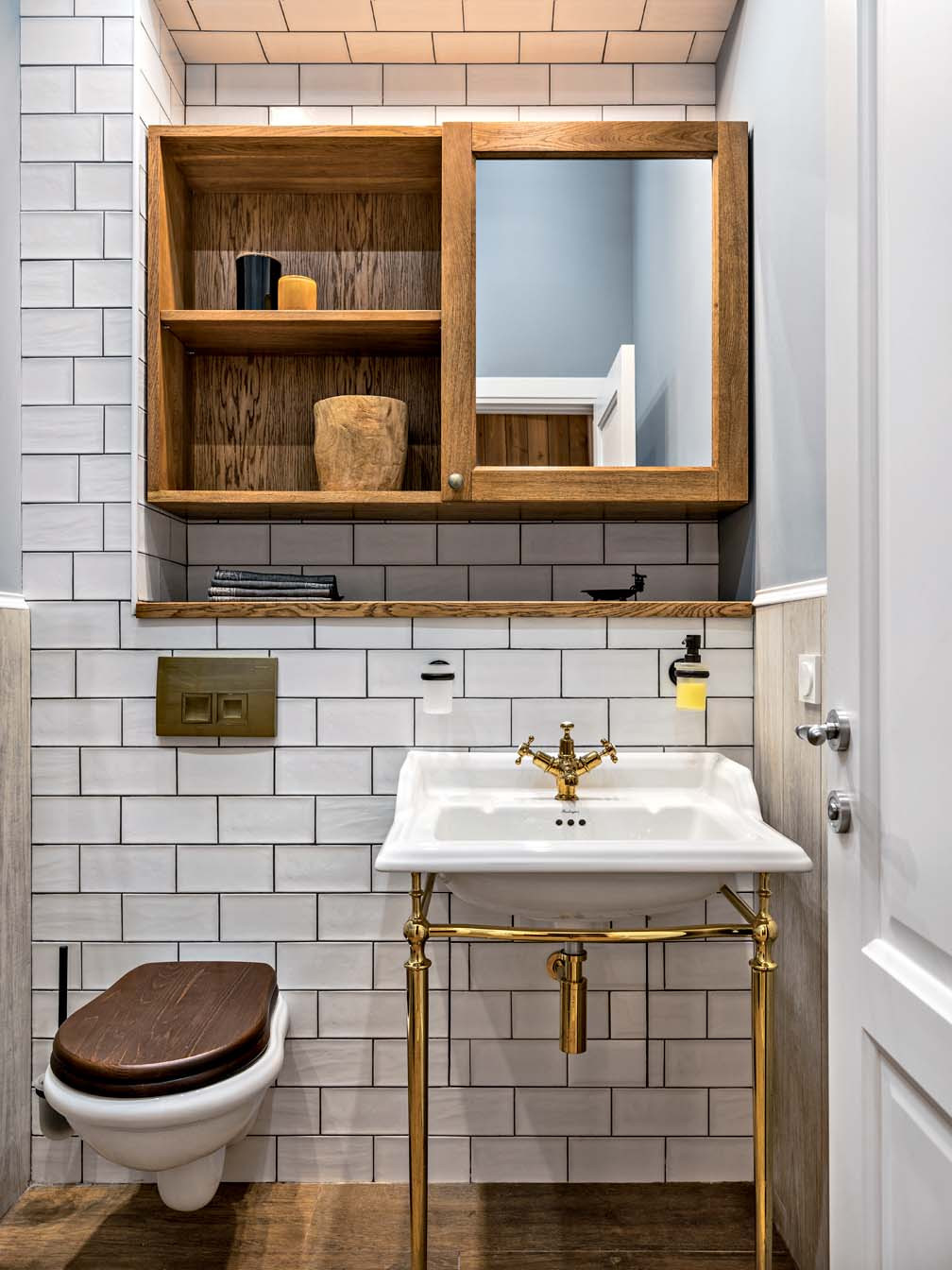 Паркетная доска, обшивка стен, потолочные панели и балки — тон во внутренней отделке дома задаёт дерево. Производимое им впечатление определяют порода и способ обработки поверхности: лакировка, искусственное старение, окрашивание, как, например, на стене гостиной, где необычный геометрический рисунок образует микс маленьких бирюзовых планок. Присутствие внушительных объёмов дерева весьма кстати в интерьерах, оформленных в стародачном стиле. Это прекрасный фон для картин, предметов декора, светильников и антикварных вещей. Не менее важен практический аспект использования деревянных панелей. Материал даёт дополнительную звуко- и теплоизоляцию и без особого трудоёмкого ухода прослужит десятки лет.