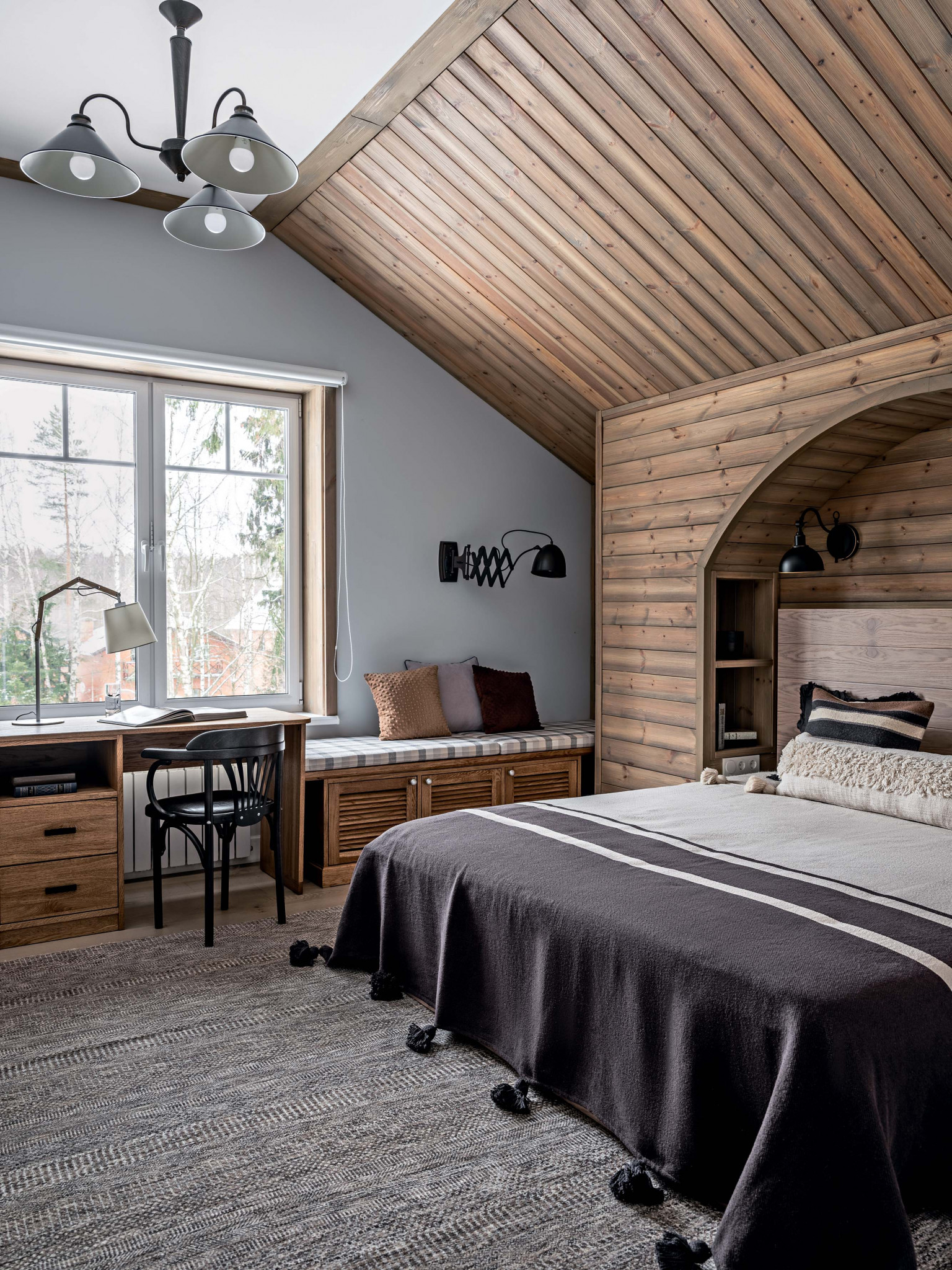 Планировочное решение несколько отличается от традиционного. На первом уровне жилого объёма организованы и общественная, и приватная зоны со спальнями хозяев. Второй этаж с двумя спальнями и огромной игровой отдан подрастающему поколению. Каждая из личных комнат имеет особое оформление: например, в спальне супруга подчёркнут мужской характер помещений, в комнате младшего сына много цвета и графики. Впрочем, интерьер, запрограммированный на долгую жизнь, имеет потенциал для развития и трансформаций.