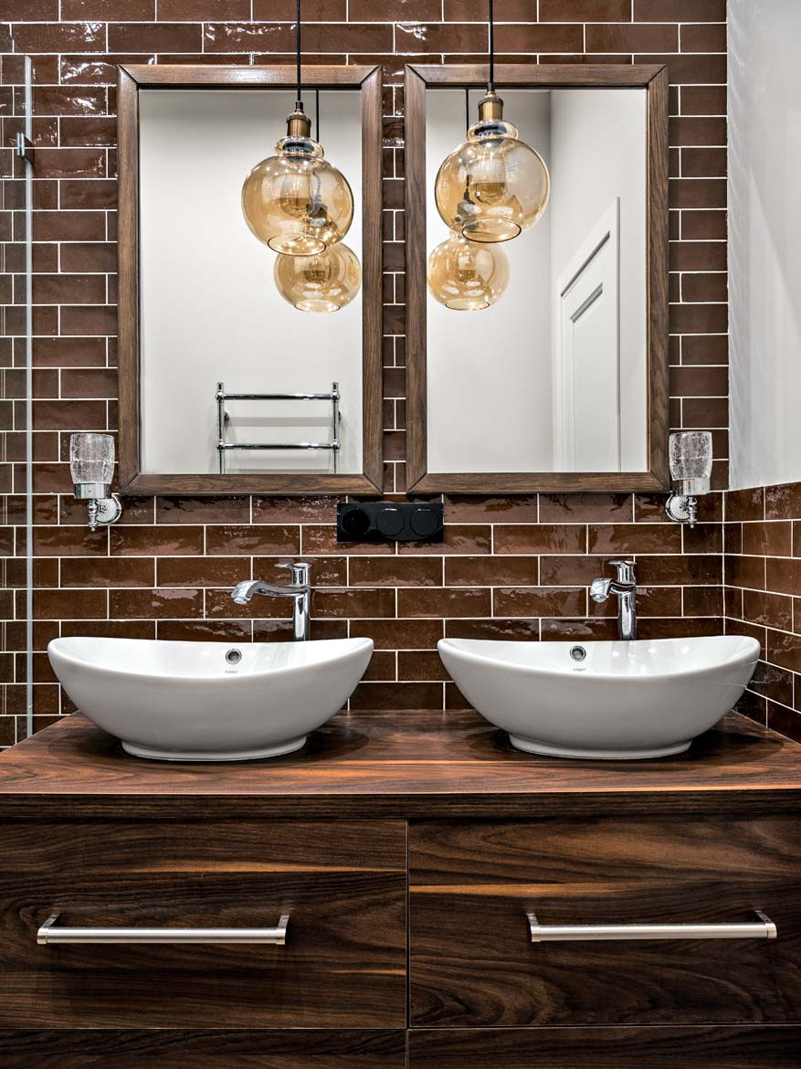 - Стены: штукатурка и шпаклёвка КНАУФ, краска, обои, керамическая плитка, доска строганая из лиственницы