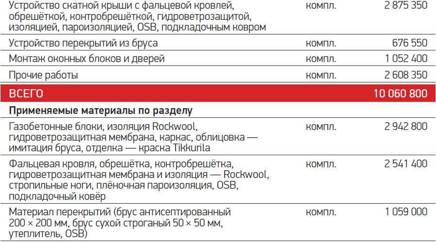 - Крыша: скатная, конструкция стропильная, гидроветрозащитная мембрана Rockwool, изоляция Rockwool, OSB, подкладочный ковёр UTA, фальцевая кровля
