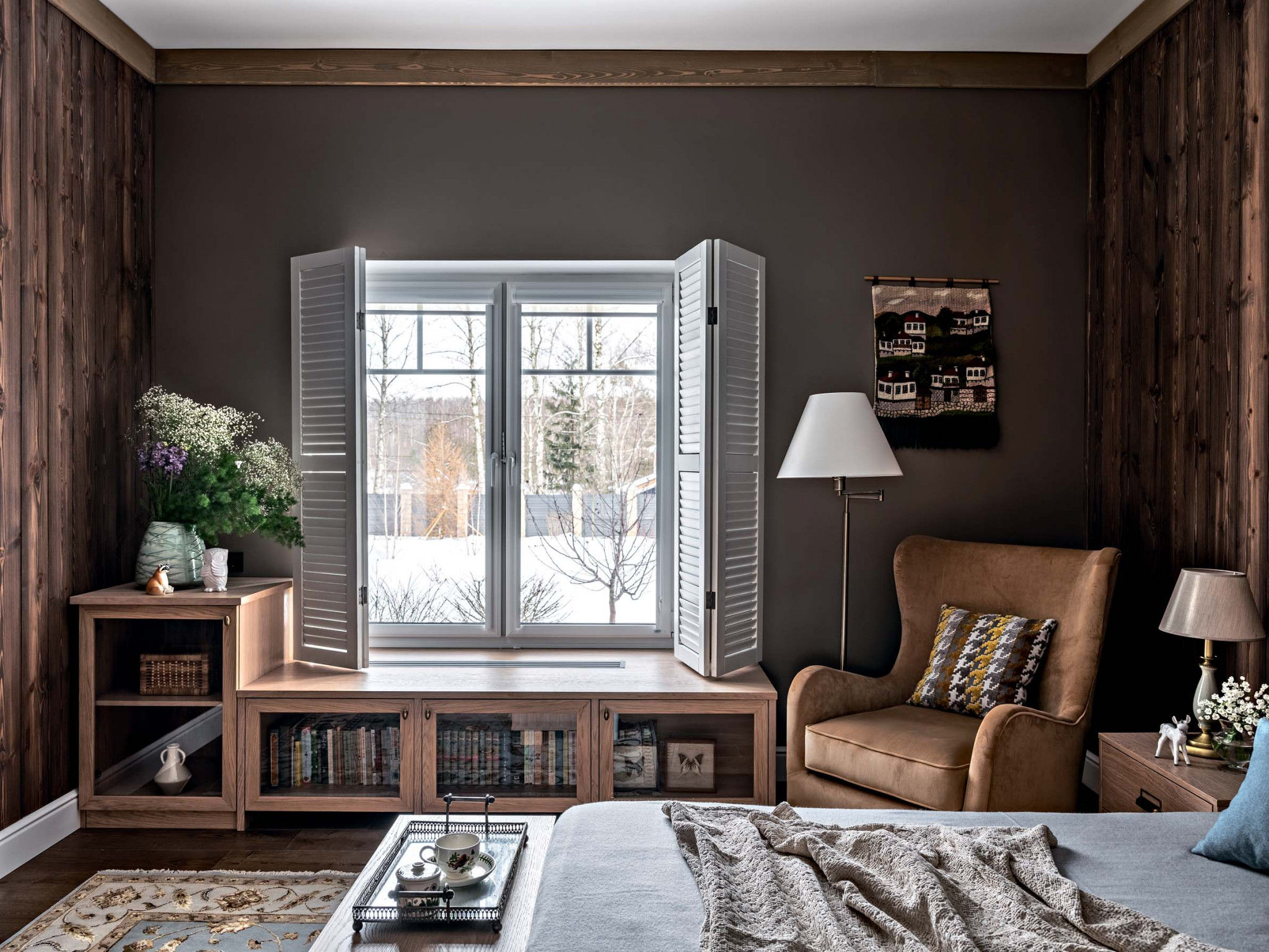 Декоративный потенциал штор огромен, но не исчезают из обихода и шаттерсы. Это интерьерные жалюзийные ставни рамной конструкции с горизонтальными рейками. Небольшие зазоры между ними пропускают и рассеивают свет, препятствуя нагреву помещения под прямыми солнечными лучами, и защищают его от любопытных глаз. Используют шаттерсы в оформлении окон, дверей, вентиляционных решёток, перегородок. Прикрепляют их к вертикальным сторонам проёмов с помощью петель. В загородном доме окрашенные деревянные шаттерсы служат достойным лаконичным обрамлением для прекрасных, сезонно меняющихся видов, тогда как эффектные шторы перетягивали бы внимание на себя.