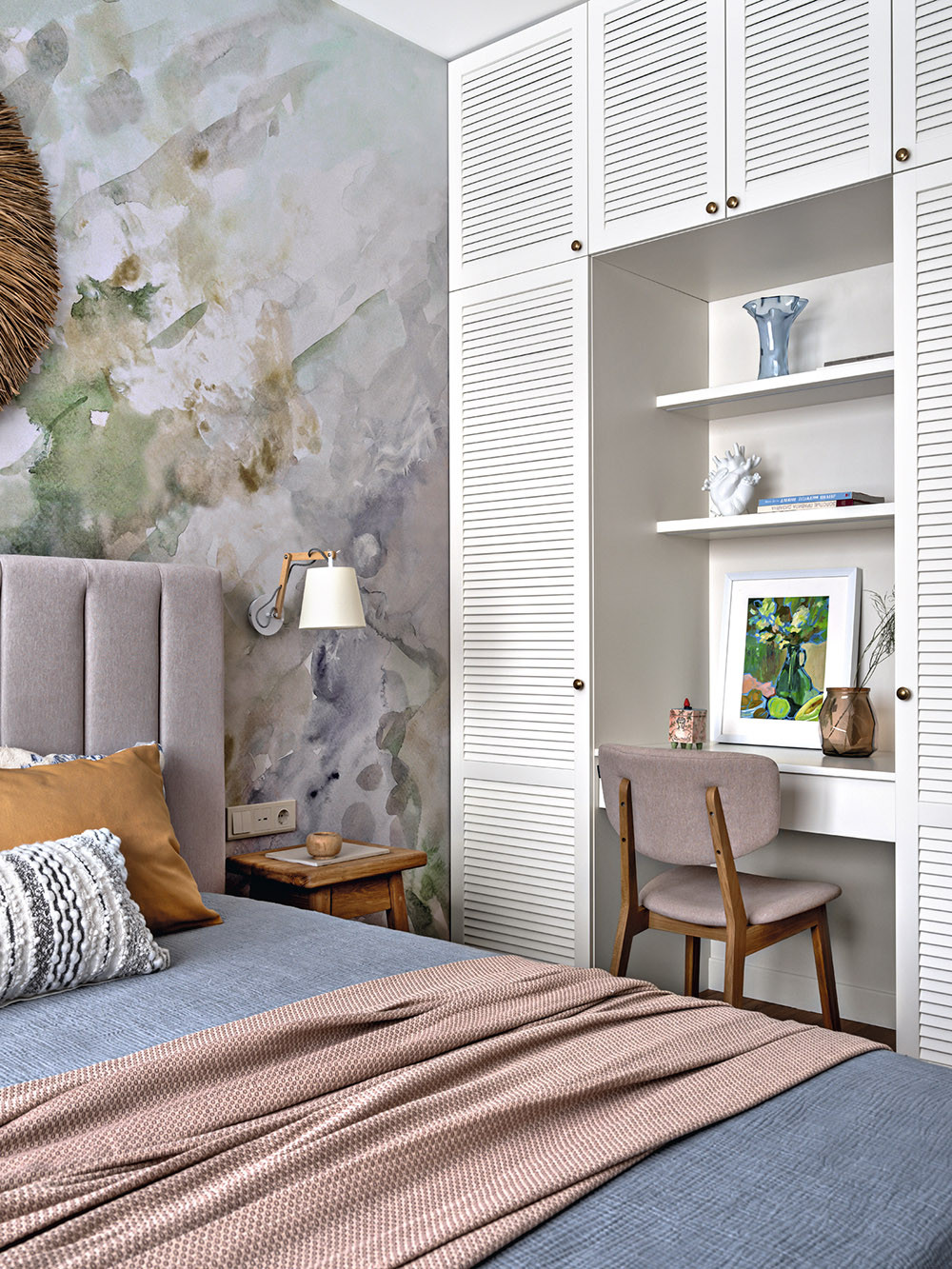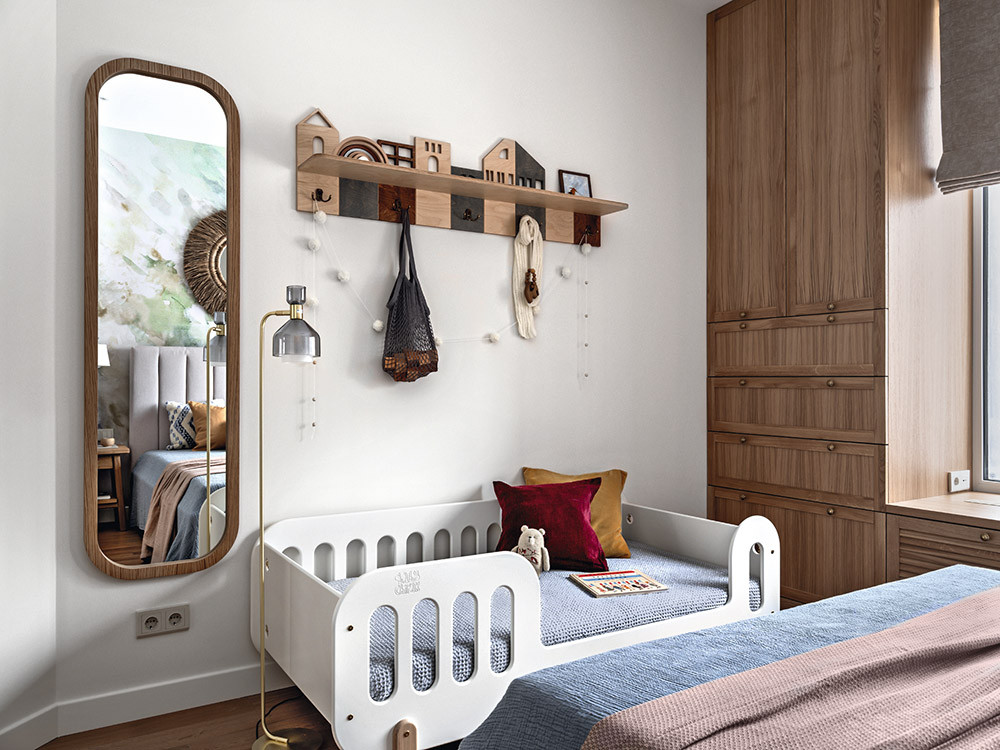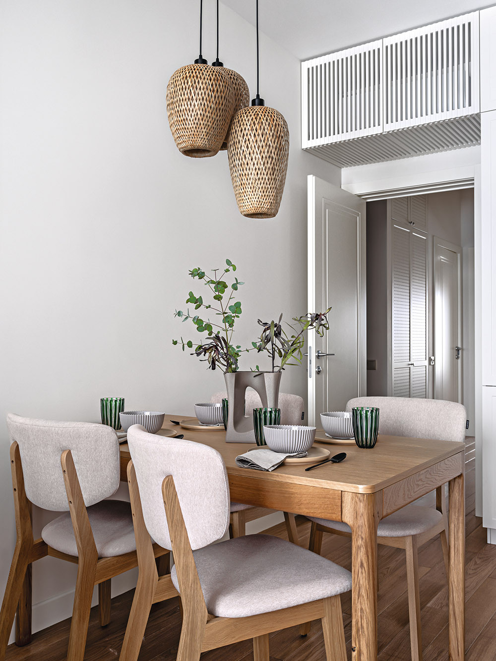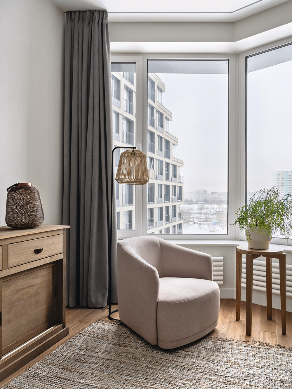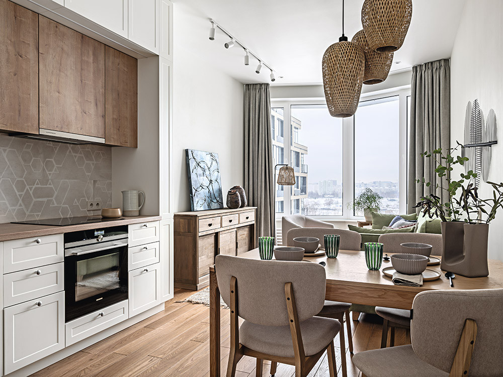 Эта квартира для семьи из четырёх человек, включая годовалого малыша, олицетворяет эстетику экостиля с использованием природных оттенков и экологичных материалов. В общем пространстве кухня органично переплетается с гостиной. Натуральные материалы привносят в интерьер лёгкость и природную привлекательность. Такая кухня-гостиная, с её простотой и теплом, становится идеальным местом для семейных завтраков и вечерних посиделок. В комнате подростка контрастные элементы и современные текстуры создают пространство для выражения индивидуальности. Удобная мебель и интеллектуально спроектированные зоны для отдыха и учёбы формируют приватное и вдохновляющее пространство. Спальня настраивает на атмосферу покоя и расслабления, здесь используются нежные оттенки и натуральные ткани. Особое внимание в дизайне уделено созданию множества мест для хранения. Интегрированные шкафы и полки становятся не только функциональными элементами, но и дополняют общую гармонию интерьера.