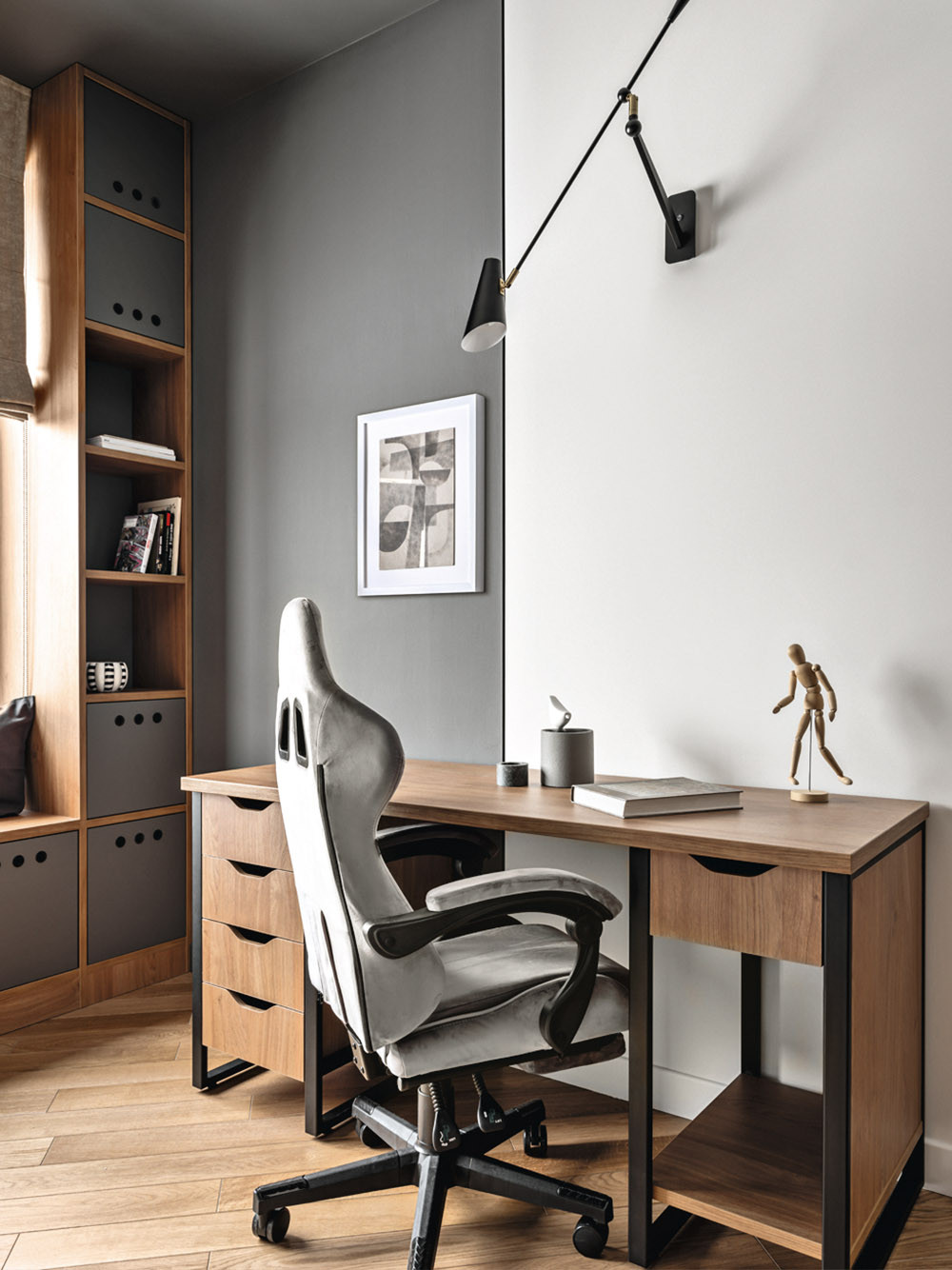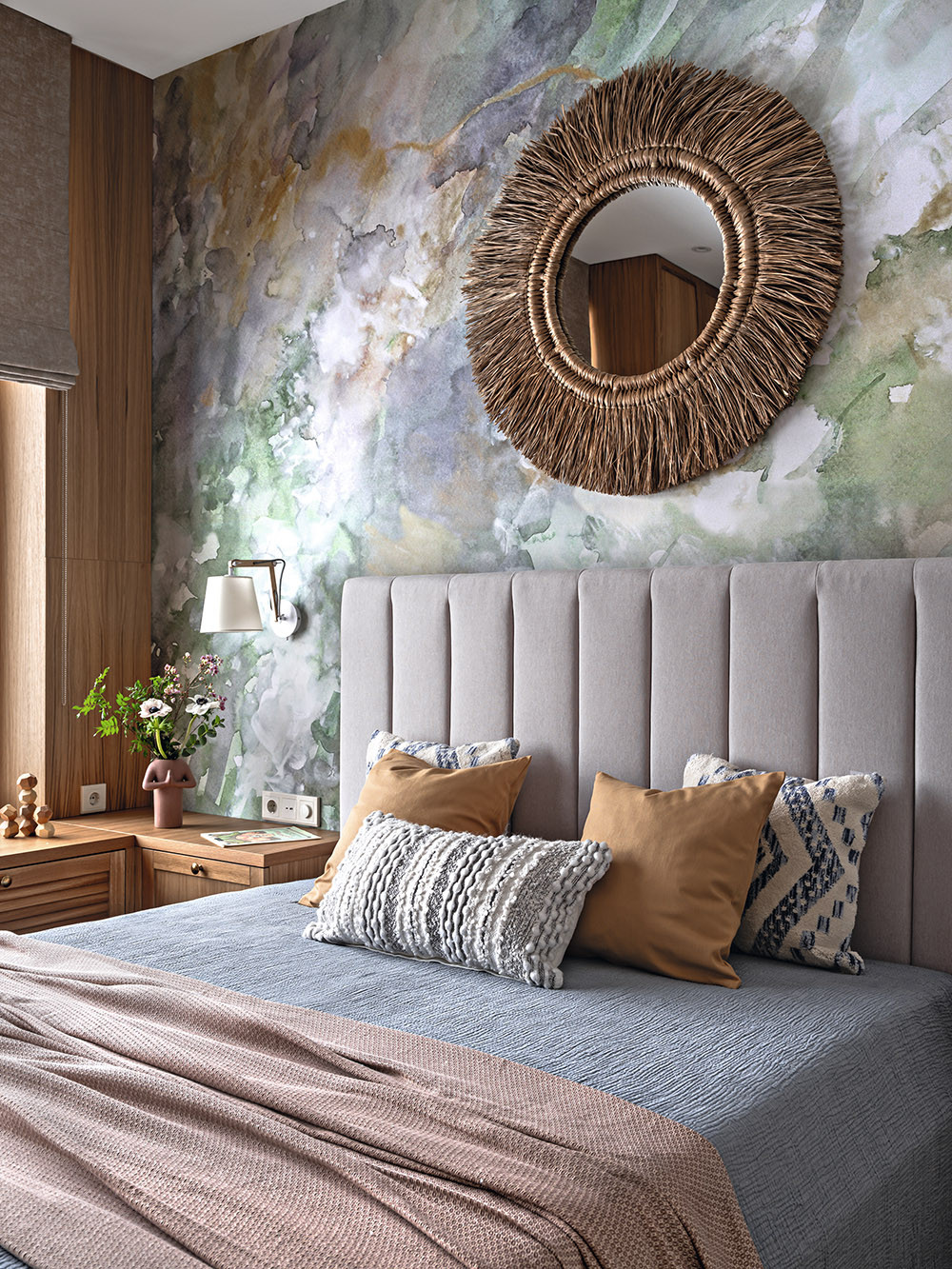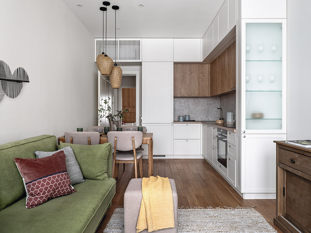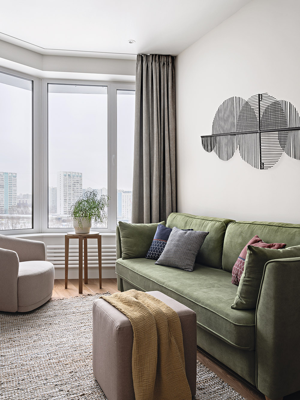 Эта квартира для семьи из четырёх человек, включая годовалого малыша, олицетворяет эстетику экостиля с использованием природных оттенков и экологичных материалов. В общем пространстве кухня органично переплетается с гостиной. Натуральные материалы привносят в интерьер лёгкость и природную привлекательность. Такая кухня-гостиная, с её простотой и теплом, становится идеальным местом для семейных завтраков и вечерних посиделок. В комнате подростка контрастные элементы и современные текстуры создают пространство для выражения индивидуальности. Удобная мебель и интеллектуально спроектированные зоны для отдыха и учёбы формируют приватное и вдохновляющее пространство. Спальня настраивает на атмосферу покоя и расслабления, здесь используются нежные оттенки и натуральные ткани. Особое внимание в дизайне уделено созданию множества мест для хранения. Интегрированные шкафы и полки становятся не только функциональными элементами, но и дополняют общую гармонию интерьера.