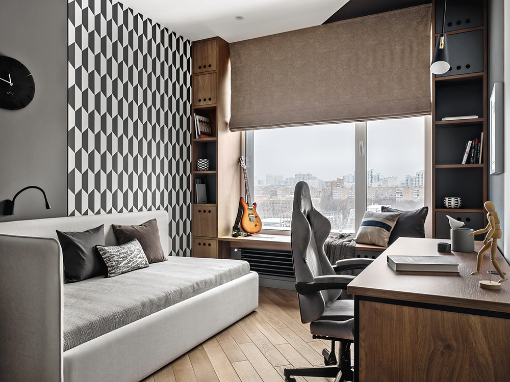 Перед дизайнером была поставлена задача комфортно разместить в двухкомнатной квартире четырёх человек: сделать уютную спальню родителей с кроваткой для малыша, обустроить стильную комнату для сына-подростка, а общую гостиную организовать в просторной кухне. Семье требовались выделенная постирочная зона и обширные системы хранения. Важная роль отводилась звукоизоляции помещений, чтобы малыш не будил своим криком брата, а тот, в свою очередь, не мешал спать младенцу музыкой в комнате по соседству.