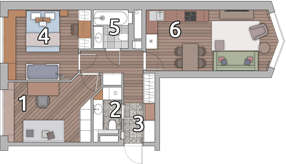 Перепланировка. Внутренние перегородки в квартире были ненесущими, что дало возможность немного увеличить площадь супружеской спальни, изменить геометрию детской комнаты, коридора и санузла при входе в квартиру. Получившиеся сложные по конфигурации объёмы позволили компактно разместить в гостевом санузле постирочную зону, создав иллюзию прямоугольного помещения. В комнате сына образовавшуюся диагональ визуально скорректировали встроенной мебелью и направлением укладки паркетной доски. В коридоре же получилось выделить места для встроенных шкафов не только по длинной стене при входе, но и напротив ванной комнаты рядом со спальнями.