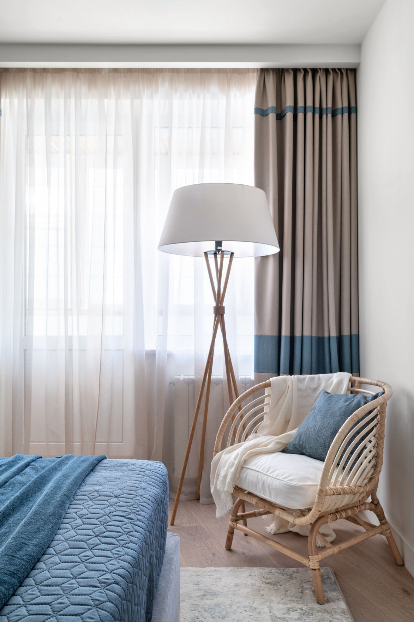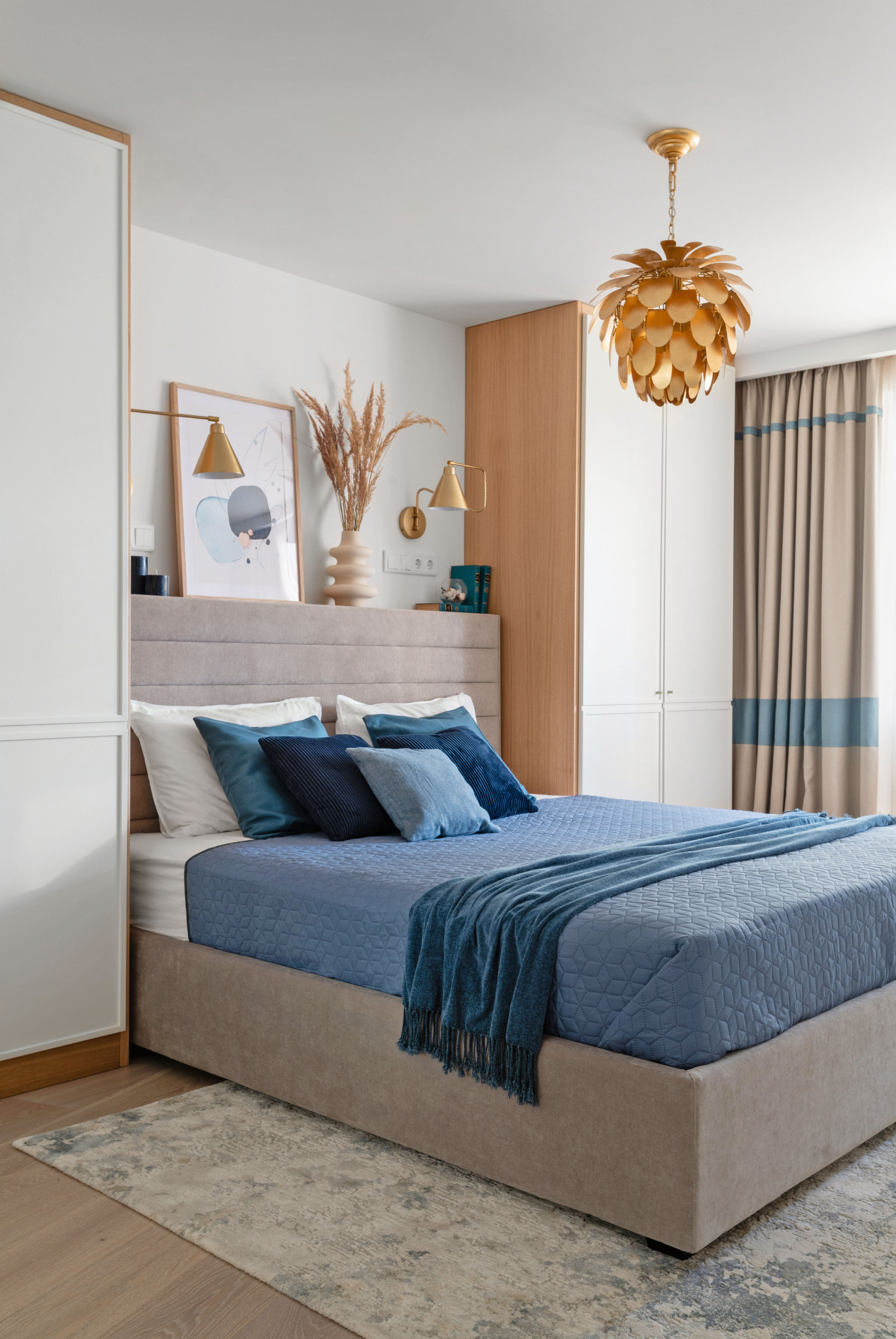 За основу во всех помещениях мы взяли светлый цвет стен, «стокгольмский» белый, и добавили оттенки синего и голубого в текстиль, декор и мебель. В ванной комнате, для которой хозяйка заранее приобрела светлую плитку, часть стен сверху, 20-сантиметровый «кант», покрасили в серо-синий цвет специальной влагостойкой краской. Таким образом, все помещения в квартире объединены общим стилем и одной задумкой. Потолочного света в квартире совсем немного. В спальне и детской ограничились люстрами-артишоками из латуни, которые везли из Америки. Настенные светильники заказывали из Швеции. Они очень эргономичные, на длинных регулируемых ножках, что позволяет менять их местоположение при чтении или убирать к стене, чтобы не мешались. Именно такой свет любят в скандинавских странах. В этом проекте всё сложилось идеально, потому что и высота потолков не позволила бы нам сделать встроенное освещение.