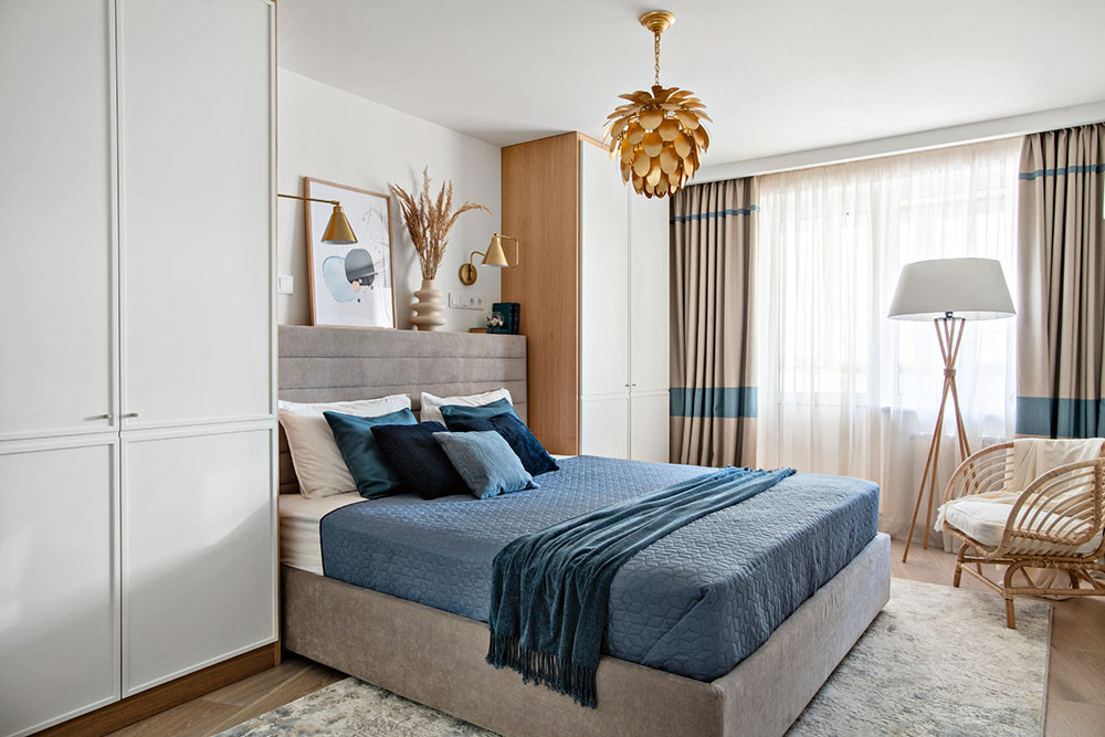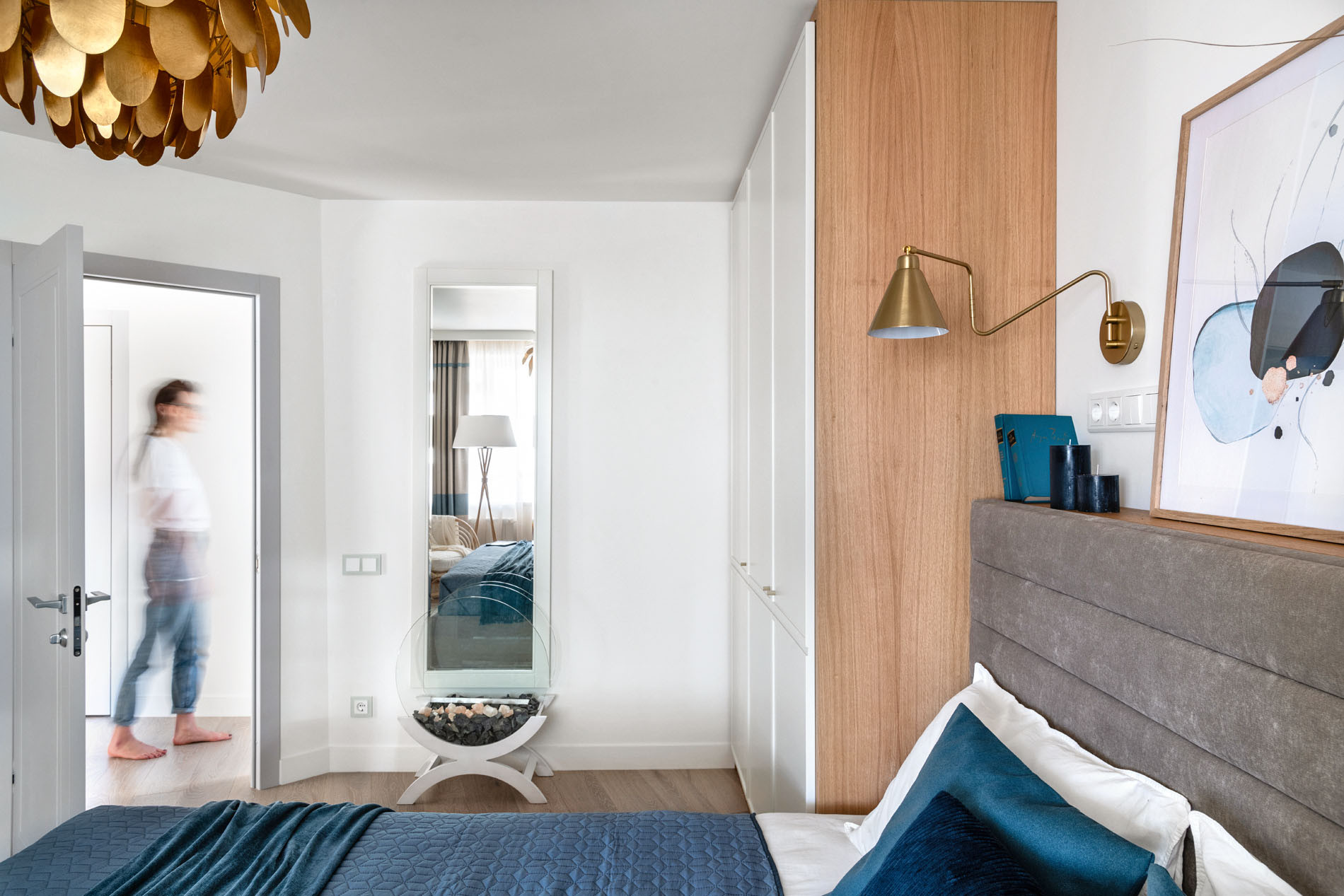 Чтобы в спальне хозяйки поместилось как можно больше шкафов, обошлись без тумбочки; кровать выдвинули на 20 см и за изголовьем сделали полку для аксессуаров, а также розетки для зарядки гаджетов