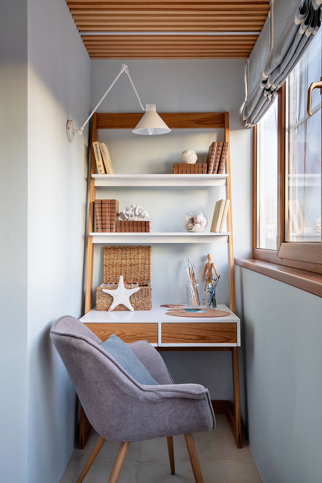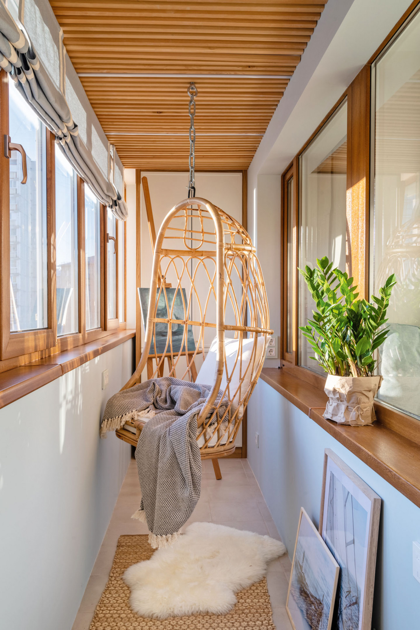 Заказчица охотно согласилась на предложение дизайнера добавить в концепцию оформления лоджии «чуть-чуть Бали» и повесить кресло из натурального ротанга. Поиски подходящего экземпляра заняли настолько много времени, что в определённый момент, путешествуя по Бали, дизайнер даже собралась подобрать нужное изделие прямо на месте и привезти его в Россию. Однако совершенно случайно идеальная модель всё же отыскалась в одном из мебельных магазинов столицы. Кресло анкерным болтом закрепили на оптимальном уровне. Потолок оформили деревянными рейками, а между ними заподлицо встроили профильные светильники, тем самым поддержав тематический дизайн. Прохладный оттенок голубого выбран для стен лоджии неслучайно — окна выходят на солнечную сторону.
