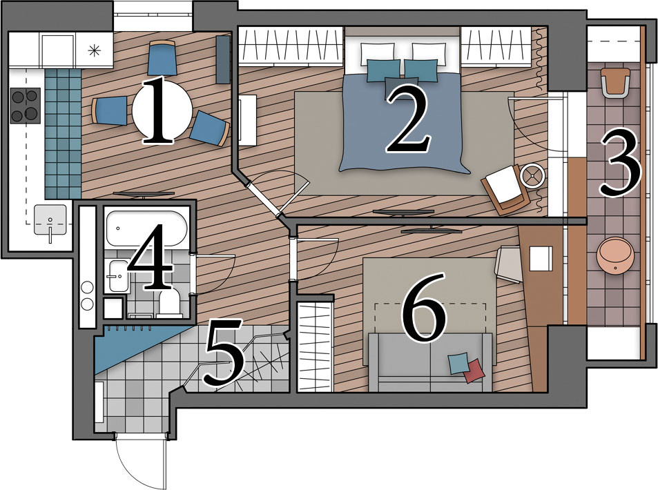 1. Кухня — 11 м2 2. Спальня — 17 м2 3. Лоджия — 5 м2 4. Ванная — 2 м2 5. Прихожая — 8 м2 6. Детская — 12 м2