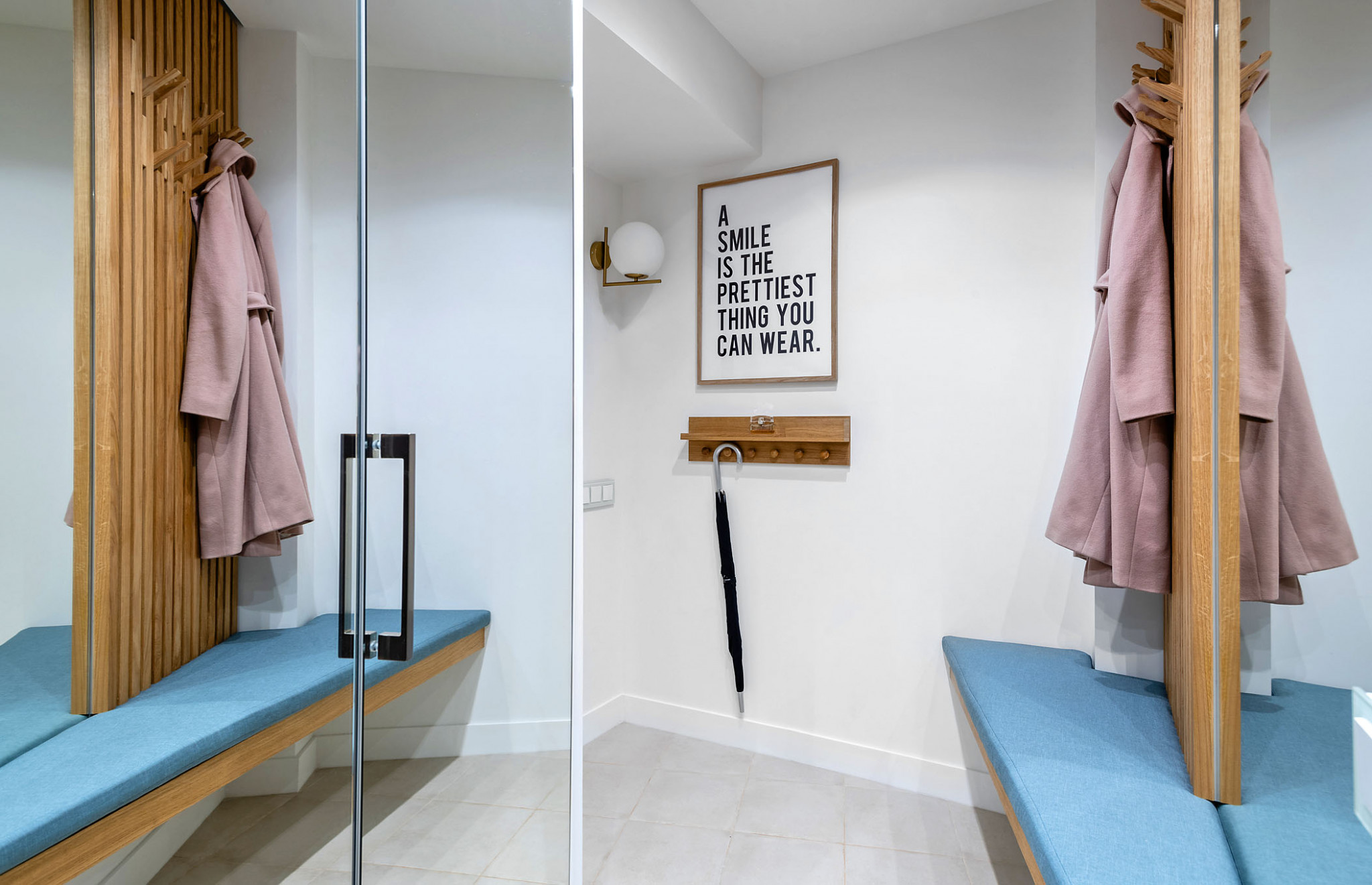 Перепланировка. Чтобы входная зона производила впечатление цельного современного пространства, дизайнер убрала дверь и простенок при входе в кухню. Плита в кухне электрическая, поэтому объединение не нарушало нормы Жилищного кодекса РФ. Вход в первую комнату из коридора (детскую) перенесли. В результате в коридоре образовался угол для установки полноценного шкафа (для верхней одежды) с большой антресолью (для чемоданов) и полками (для сумок, перчаток и шарфов). Там же, в шкафу, спрятали электрический щиток.