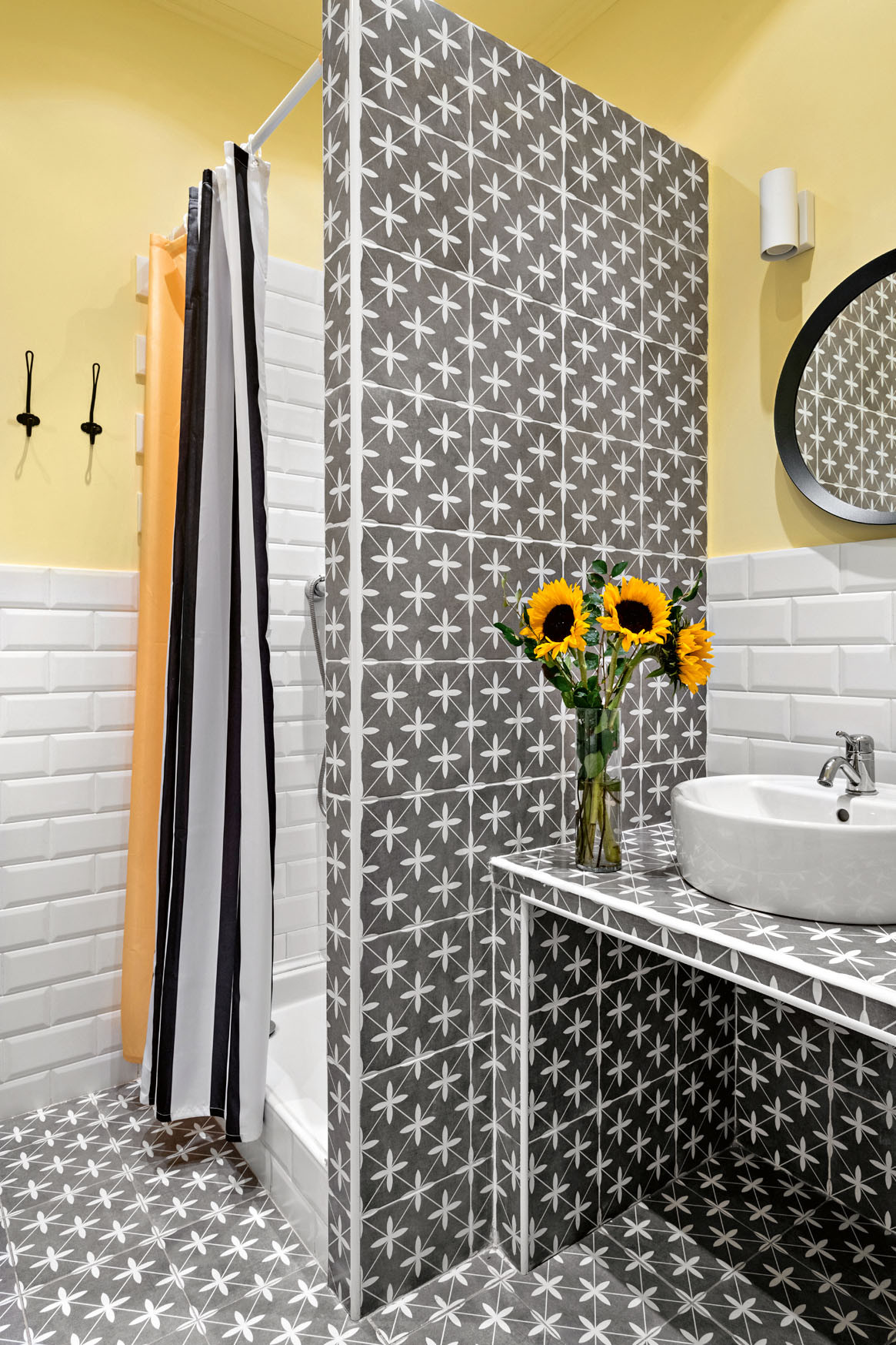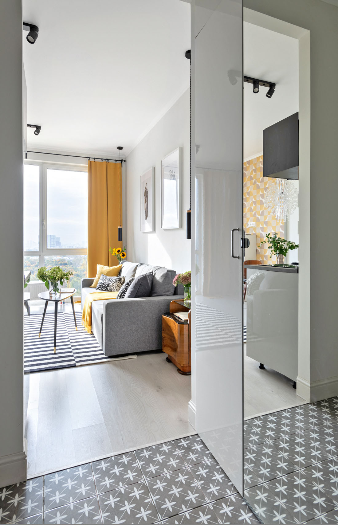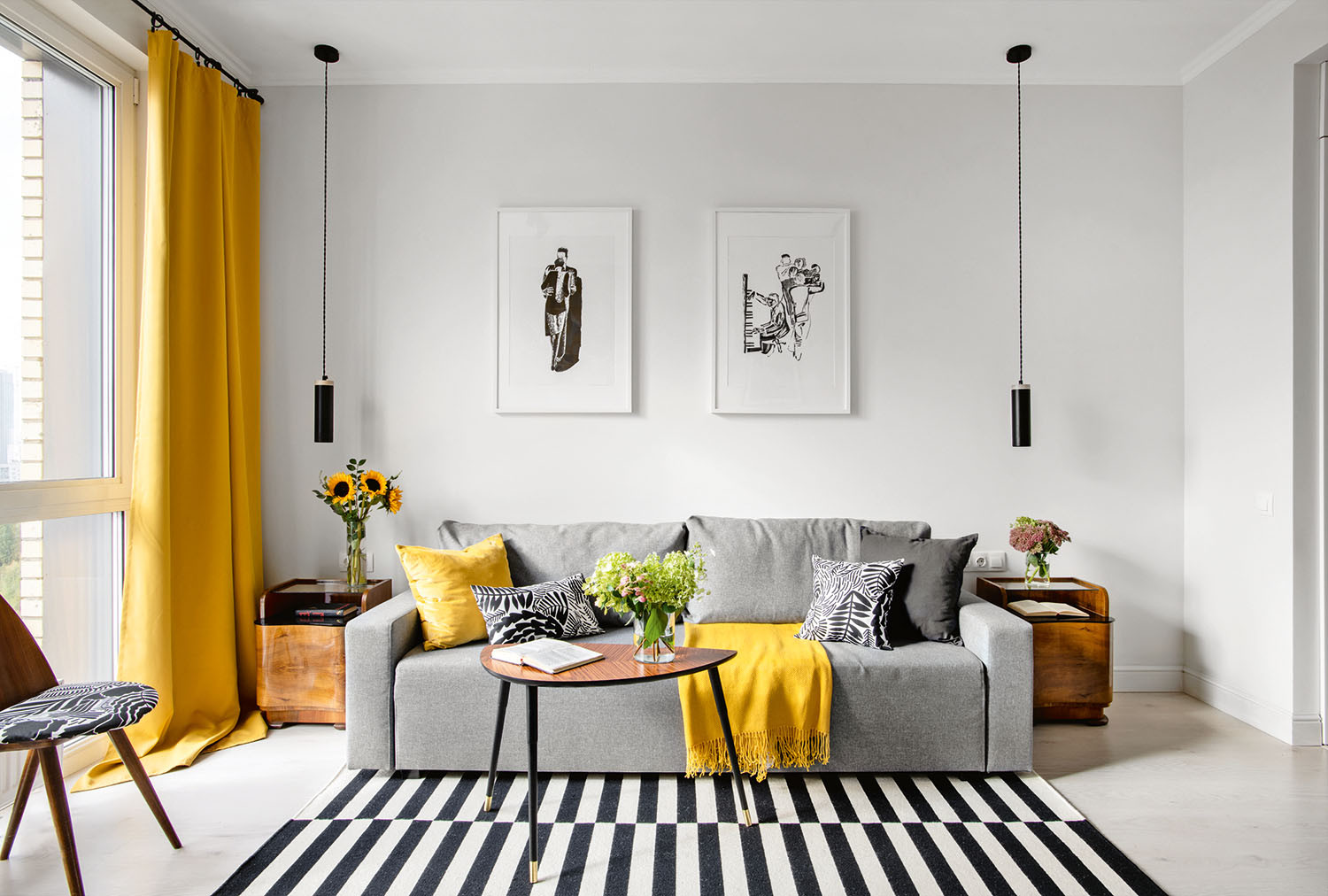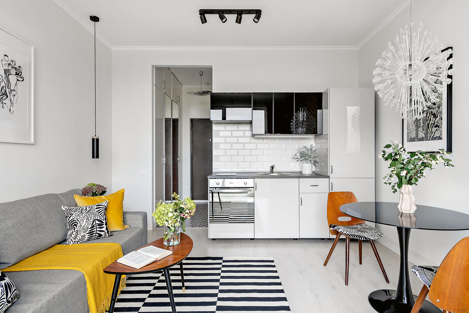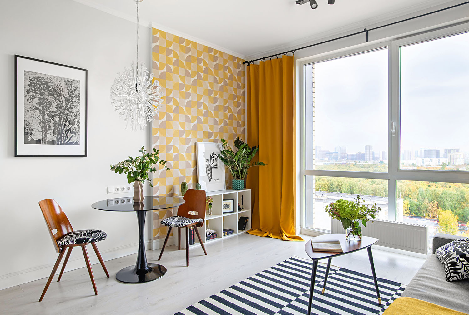 Дизайн. Современная интерпретация стилистики mid-century modern позволила создать гармоничный баланс между скромными размерами, требованиями удобства и свободного передвижения. В отделке задействовано всего четыре цвета: белый, чёрный, жёлтый и серый, причём первые — весьма характерны для mid-century modern, как и чёрное стекло, и глянцевые поверхности дерева тёплых коричневых оттенков. Насыщенный жёлтый цвет портьер и его вкрапления в геометрический узор панно усиливают впечатление щедрых солнечных лучей в зоне окна. Отзвук «солнечной темы» — в жёлтом колорите стен санузла. Чёрный, которого порой опасаются те, кто стремится придать интерьеру максимальную воздушность и жизнерадостное настроение, не