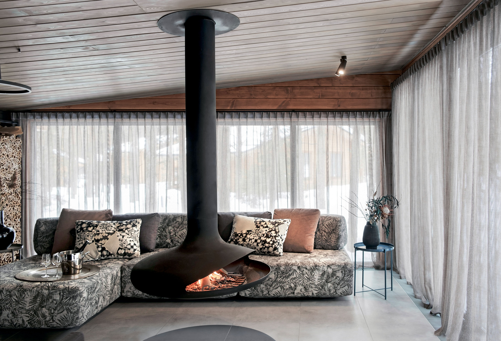 В результате переделки неиспользуемой части гаража, совмещённого с баней, получился многофункциональный домашний спа-комплекс с сауной и хаммамом. Вертикальной доминантой просторной гостиной стал эффектный подвесной камин. Уютно расположившись рядом с ним на больших диванах, можно общаться, отдыхать или медитировать, глядя на огонь и живописный сосновый бор