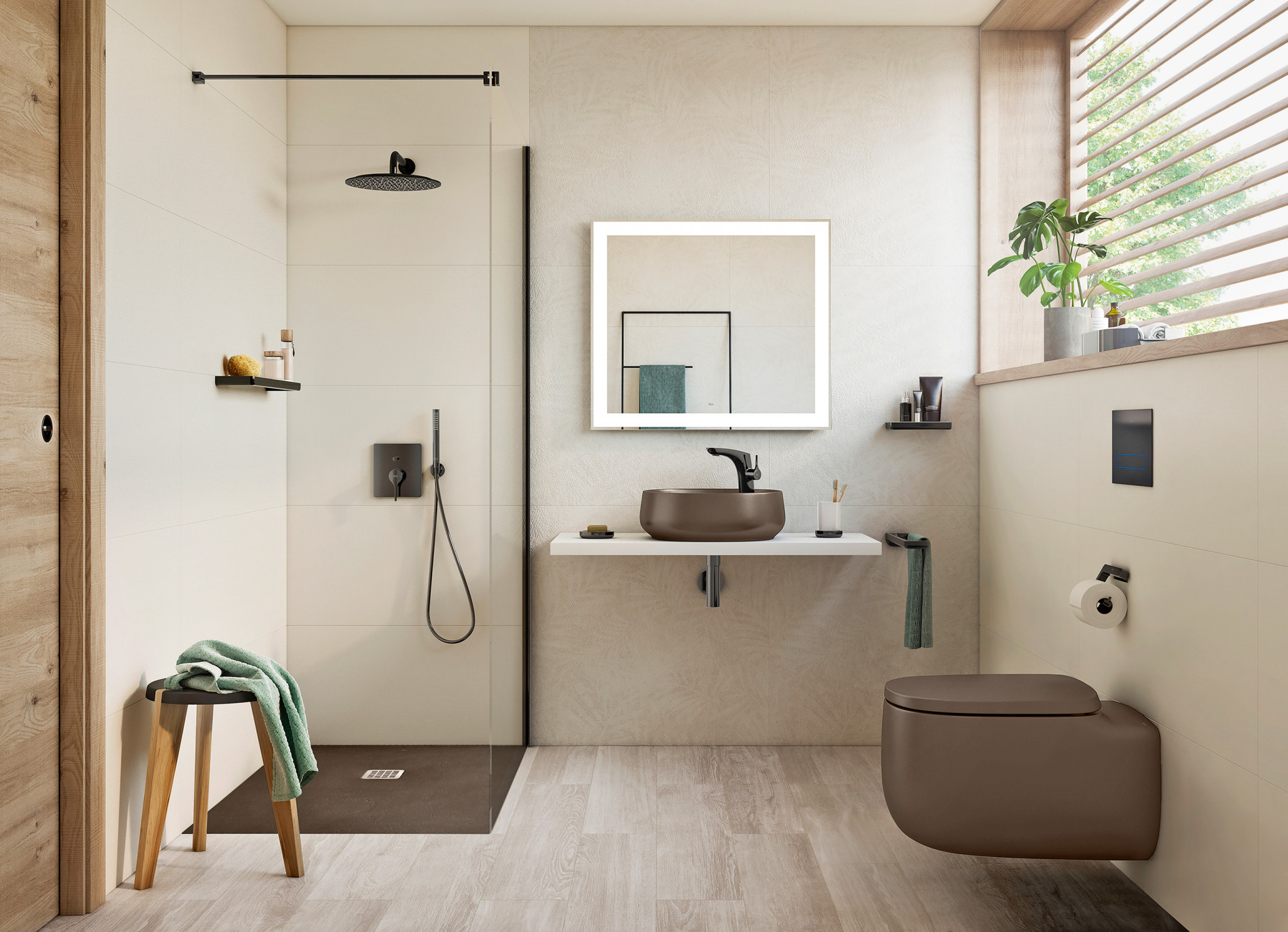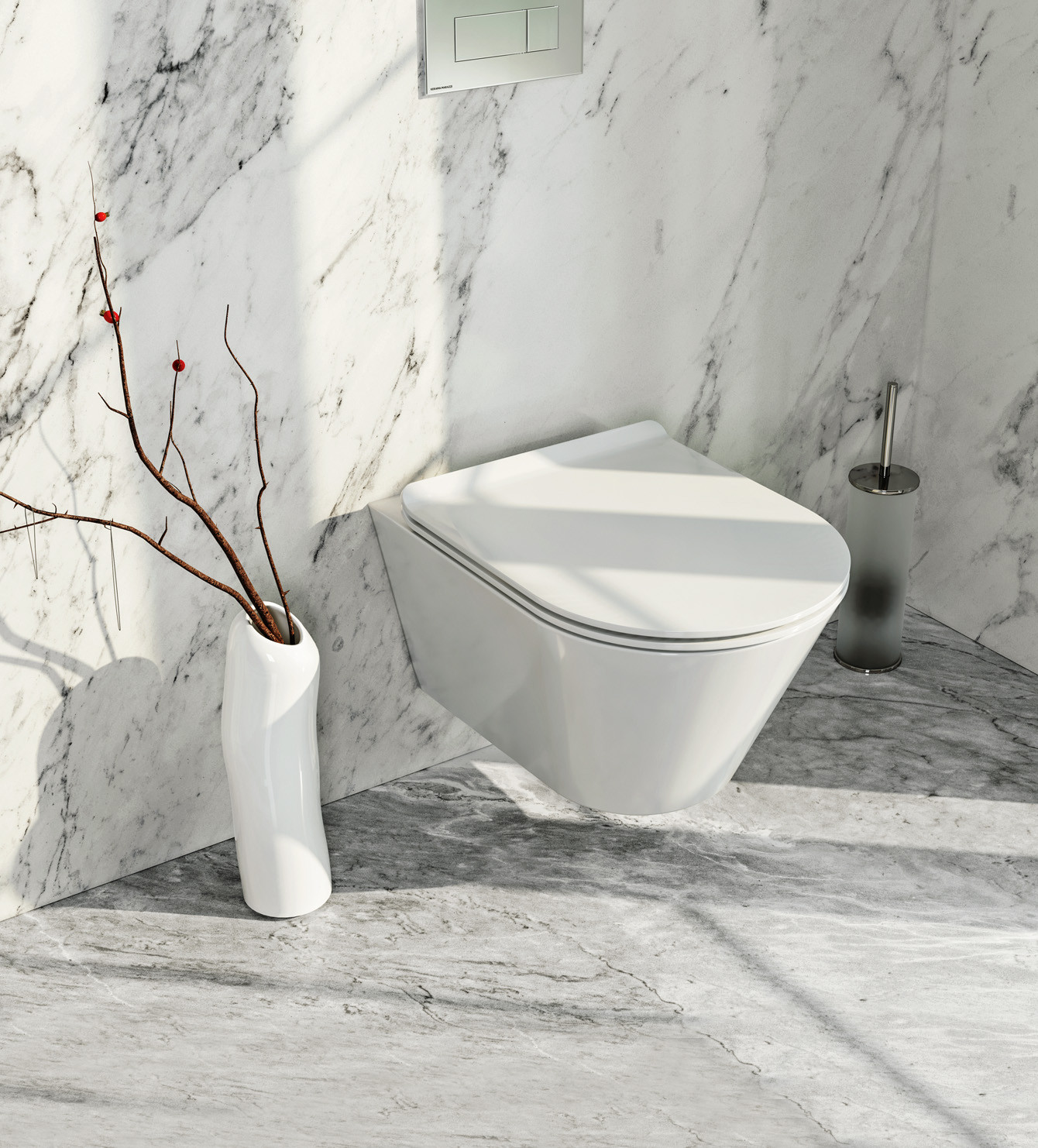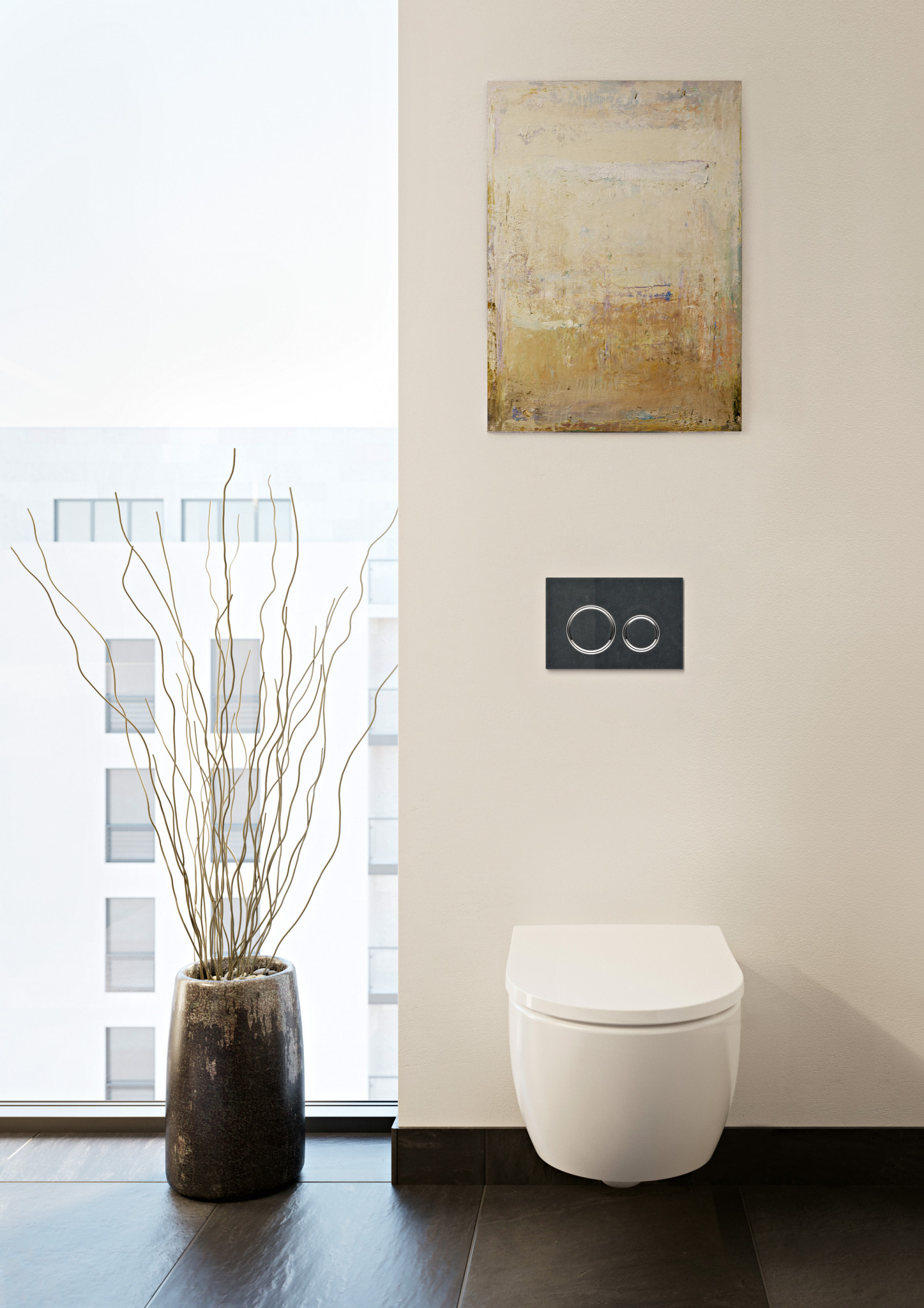 Инсталляционная система смыва, закрытая отделкой, по сути, представляет собой «запечатанный» в стене сливной бачок (плоский и высокий), закреплённый на раме. Конструкция отнимает максимум 20 см от глубины пространства. За счёт большей высоты смыва напор становится сильнее и позволяет расходовать меньше воды. Вместо замысловатых форм бачка, которые порой сложно протирать от пыли, имеется ровная, облицованная керамической плиткой вертикальная поверхность. Тихий слив — заслуга инженерных решений. Кроме того, у напольной модели унитаза появляется альтернатива — подвесная (она же консольная), закреплённая на металлической раме инсталляции в стене и не имеющая «ноги» или постамента. Таким образом высвобождается пространство под чашей и упрощается уборка пола.
