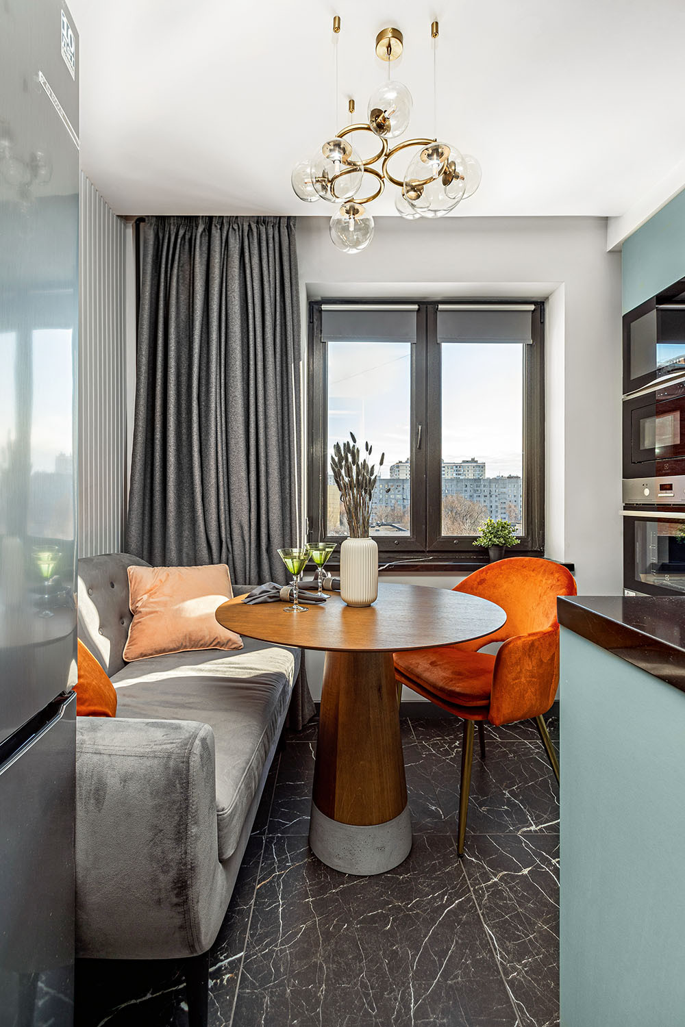 Активную, насыщенную бирюзу кухонного фартука оттеняют природные деревянные фактуры и нейтральные светло-серые тона мебели. Вообще, эта интерьерная история морских тропиков не лишена визуального и тактильного уюта. За него отвечают круглый стол, диван и кресло мягких форм