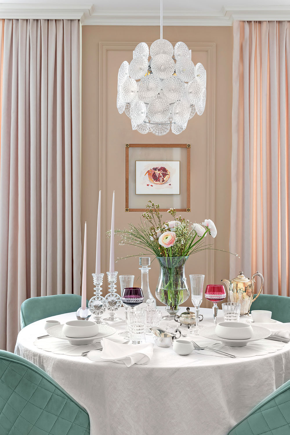 В интерьере присутствуют элементы классического стиля, но в целом дизайн современный, соответствующий образу жизни хозяйки, её желанию воплотить интересный эстетический микс. Женщина прекрасно осведомлена, что сейчас не придерживаются строгих канонов. Более того, ей импонирует предложенное индивидуальное решение, основой которого послужили природные и ретромотивы. Так появились бирюзовые, словно море, участки стен, плитка под оникс и винтажная люстра «Одуванчик».