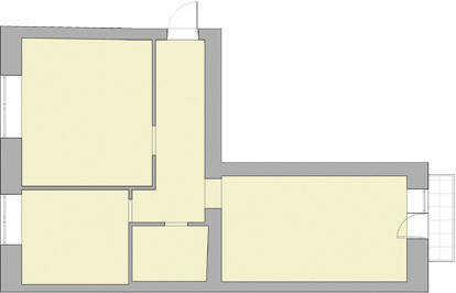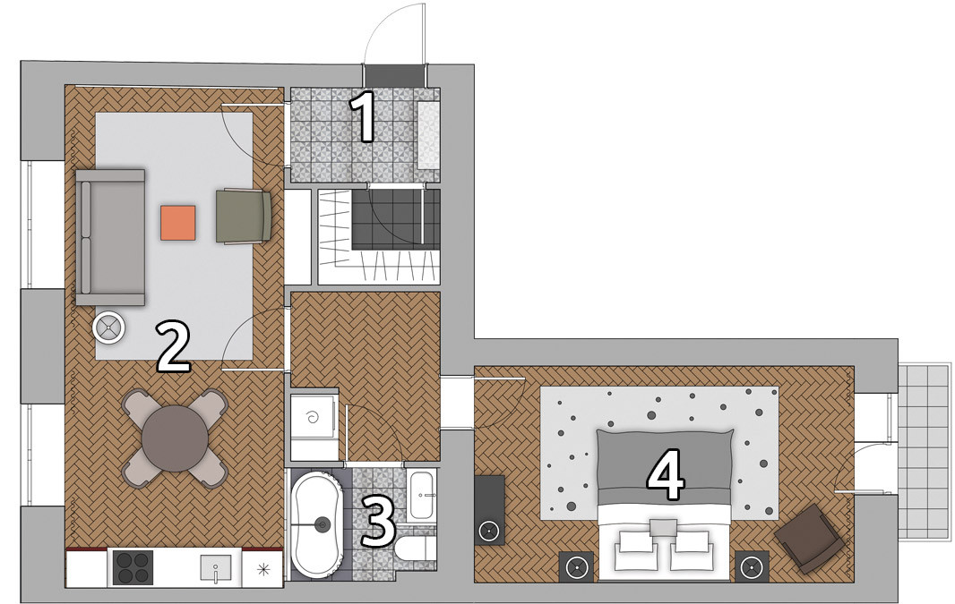 Ремонт. На полах пришлось делать стяжку. Для их отделки выбрали паркет — он подходит по стилю, его можно реставрировать, и он красиво стареет. Новые перегородки выполнили из ГКЛ из-за быстроты возведения. Для отделки стен прихожей и коридора использовали краску — для удобства уборки. Стены в кухне-гостиной и спальне оклеены обоями. По мнению дизайнера, это лучший материал, чтобы создать уют и обволакивающую атмосферу. Да и тактильно они более выразительны. Потолок оштукатурили и покрасили. Всю проводку спрятали за карнизами на стыке стен и потолка.