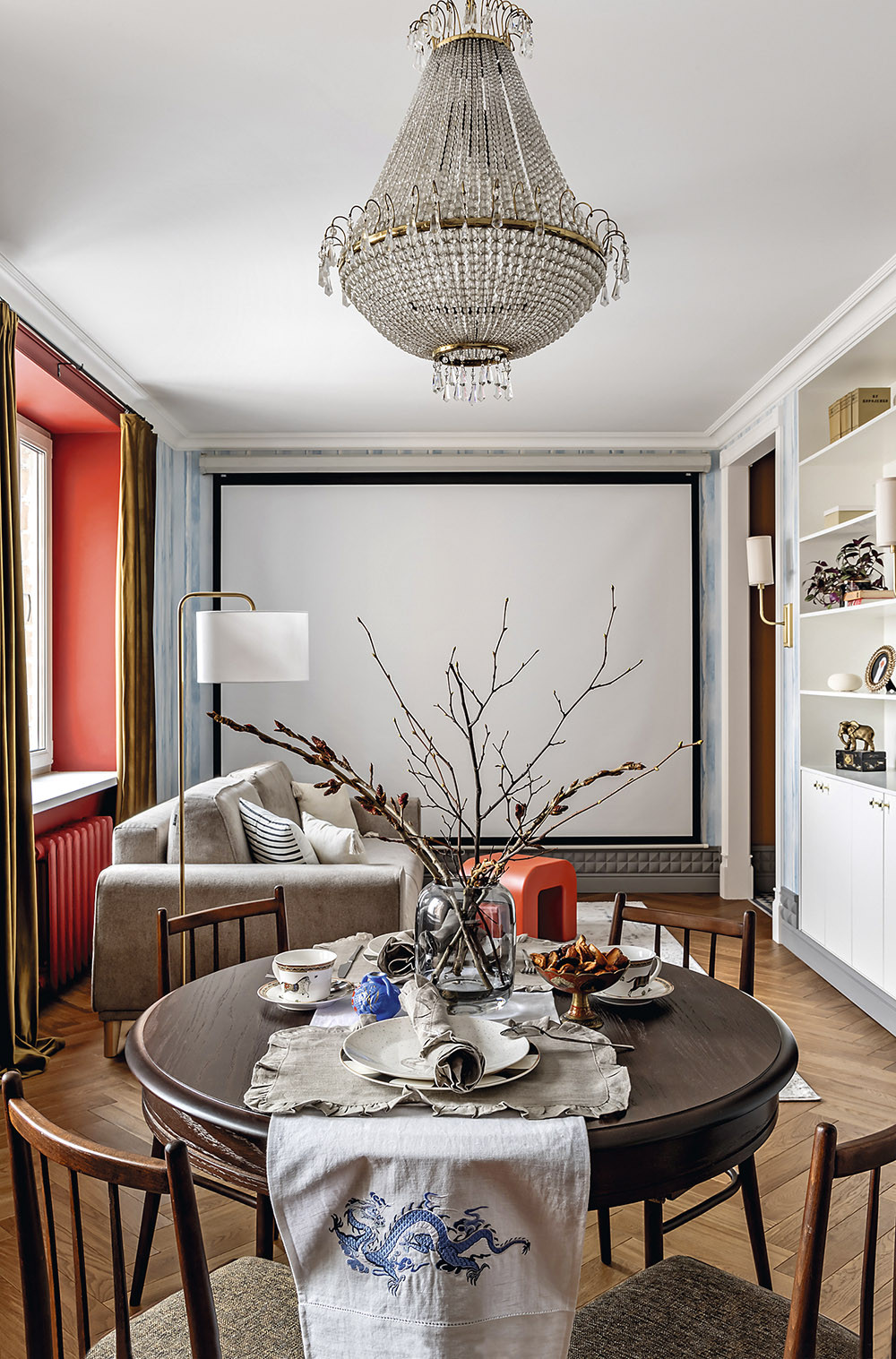 Квартира расположена в сталинке в московском районе Хамовники. Дворик с деревьями и цветами, интеллигентные соседи и потрясающие виды из окон: на МИД с одной стороны и на реку и вечерний город — с другой. И хотя это инвестиционный проект — квартира предназначалась для последующей продажи, — у неё есть свой образ и душа, соответствующие месторасположению.