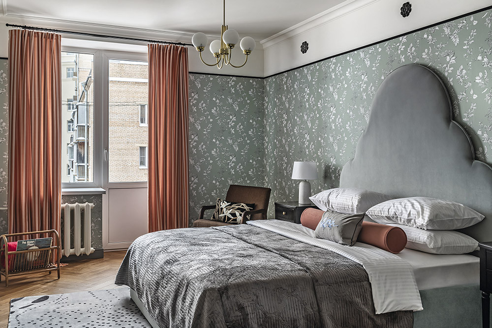 - Мебель: кровать — на заказ по эскизу дизайнера, консоль и ковёр «Диван.ру», кресло винтажное, прикроватные столики La Redoute