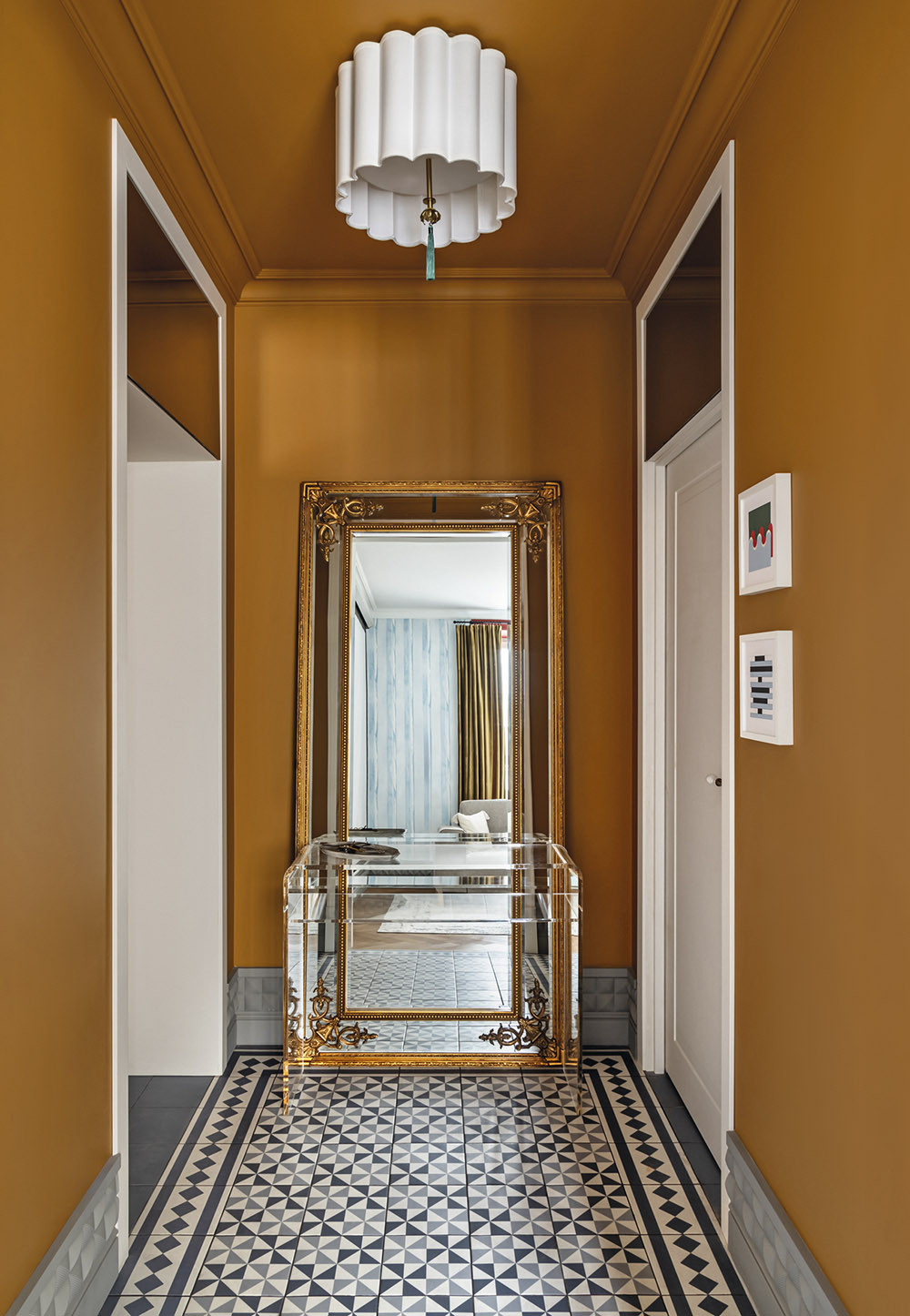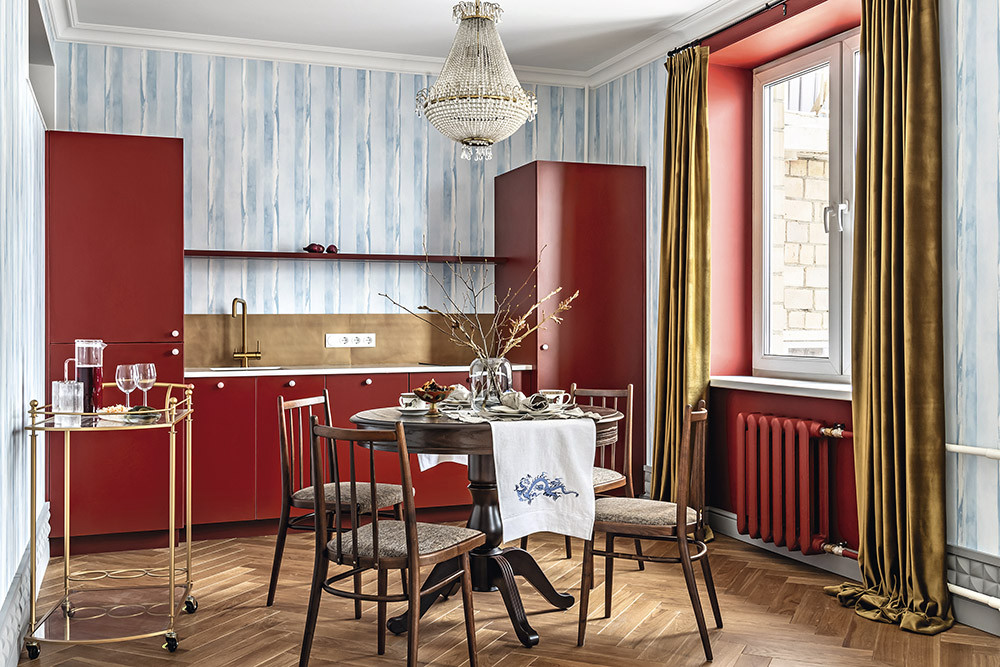 Дизайн. Автор иронично характеризует дизайн квартиры как «советский шик». Здесь встречаются и винтаж, и классика, и элементы современного стиля. В этом эклектичном интерьере гармонично совместили множество деталей и фактур таким образом, чтобы их хотелось рассматривать и постоянно подмечать что-то новое: винтажную мебель и люстру, полосатые современные обои, составной плинтус с 3D-панелями, фартук из латуни, мелкий орнамент на плитке, цветные потолки.