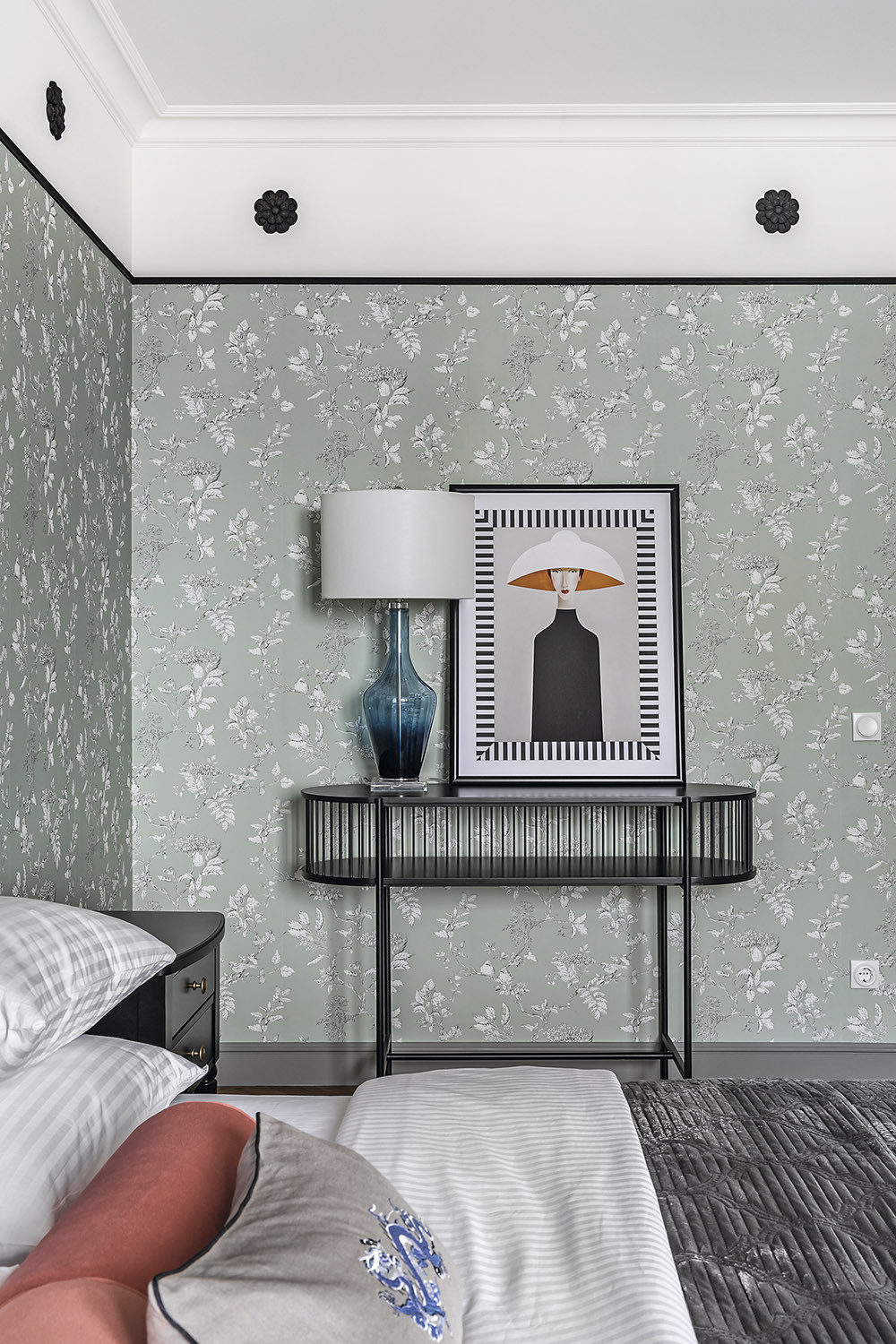 - Стены: обои Aura Laura Ashley, декоративные розетки Decomaster, гипсовая потолочная розетка Artpole
