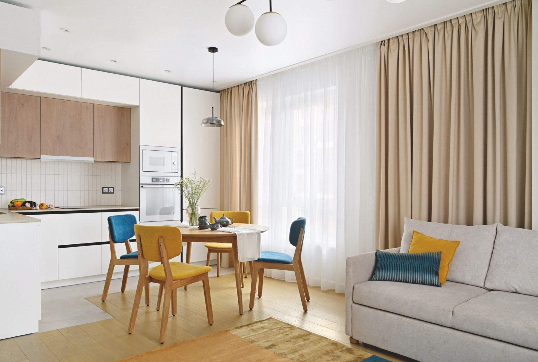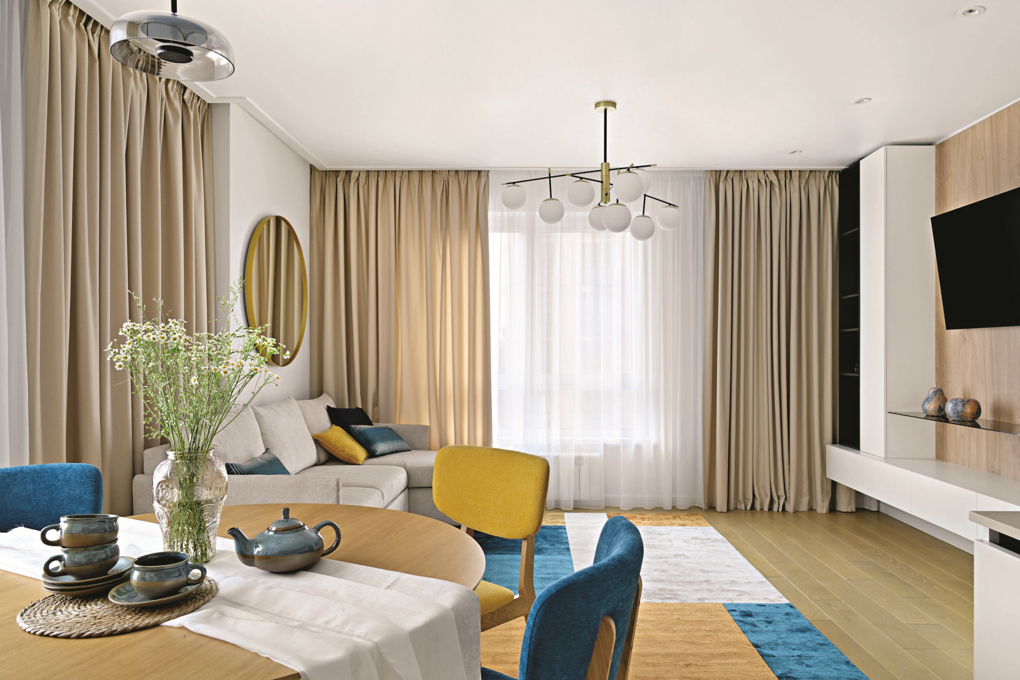 Владелица квартиры хотела получить светлую, комфортную, функциональную квартиру. Лаконичную, без лишних деталей, оформленную в пастельных тонах. Но концепцию доработали, когда заказчица прислала дизайнерам цветовую палитру, которая ей понравилась: там сочетались оттенки синего, горчичного и бежевого. По общему решению нейтральную бежево-пастельную гамму интерьера решили усилить деталями насыщенных цветов — горчичного и синего с серым подтоном. Эти цвета — из актуальной сегодня цветовой гаммы, достаточно яркие, но в то же время и приглушённые. Кричащих оттенков нет, и это напрямую влияет на атмосферу. Здесь хорошо отдыхать — и заряжаться бодростью.