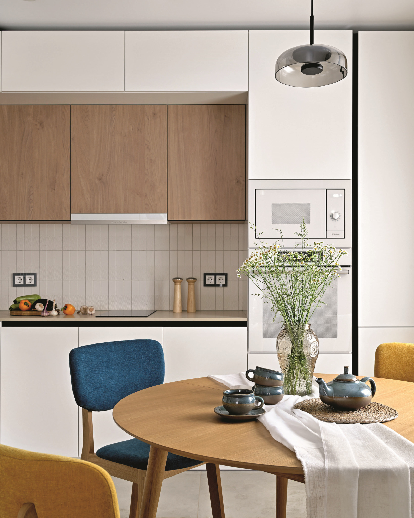 В современном монолитном доме появилась светлая и уютная квартира с яркими акцентами. Стильная евродвушка с просторной (около 26 м2) кухней-гостиной и отдельной спальней получилась в результате перепланировки стандартной двухкомнатной квартиры. Владелица квартиры — женщина, взрослая дочь которой живёт уже отдельно, но приезжает с семьёй в гости. Идея раскрыть пространство, объединив кухню с одной из комнат, оказалась плодотворной: получилось учесть запросы хозяйки и сделать пространство более функциональным.