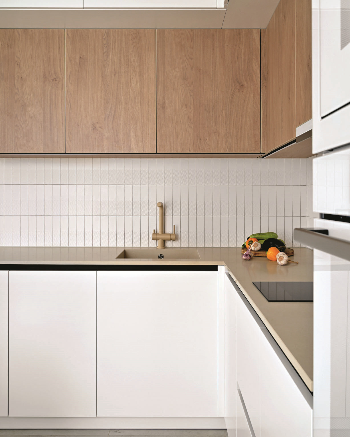 Перепланировка. Изначально это была стандартная двухкомнатная квартира в обычном монолитном доме: гостиная 13,9 м2, спальня 10,7 м2 и кухня 10,9 м2. Часть перегородок снесли, частично возвели новые, из гипсокартона. Кухню и одну из комнат объединили. За счёт коридора немного увеличили санузел и гардеробную (перенесли на 10 см в сторону спальни стены санузла и гардеробной). Вход в неё сделали со стороны прихожей — так логично разрешился вопрос с хранением верхней одежды. Ремонт. Квартира была с ремонтом от застройщика, но качество не устроило хозяйку. Поэтому часть стен снесли и все отделочные материалы демонтировали. С пола сняли ламинат, вместо него на готовую стяжку положили паркетную доску из натурального дерева. В зоне кухни, ванной и прихожей демонтировали напольную плитку, сделали новую стяжку, устроили тёплые полы и сверху уложили плитку. Перегородки в квартире были из двуслойного влагостойкого гипсокартона с утеплителем, поэтому, возводя новые, использовали те же материалы. Перегородки затем зашпатлевали и покрыли износостойкой краской.