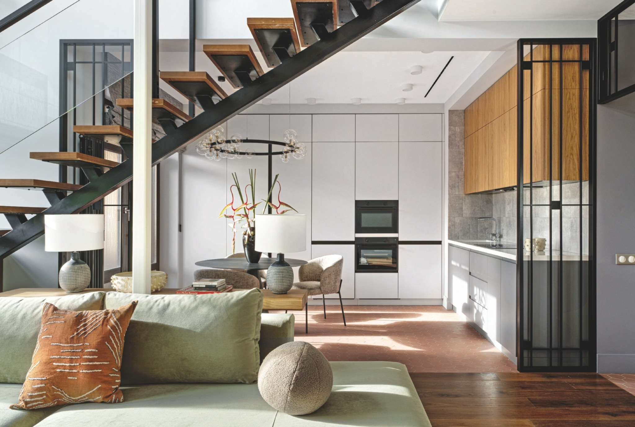 Заказчики — супружеская пара с сыном-студентом — мечтали о жизни ближе к природе, но без отказа от городского комфорта. Они хотели просторную, наполненную светом гостиную со вторым светом, как в загородных домах, и именно с этой целью приобрели квартиру на последнем этаже малоэтажного дома. Такой формат позволил объединить преимущества частного дома и городских апартаментов: близость к природе, камерность и тишину — с удобствами развитой инфраструктуры.