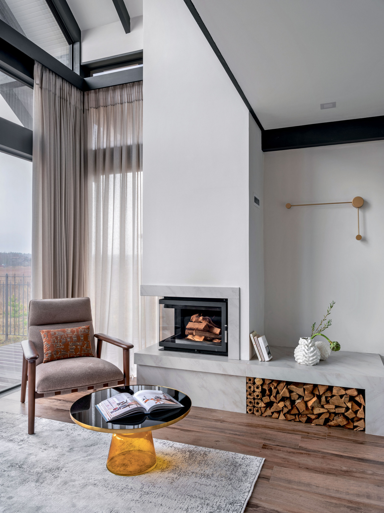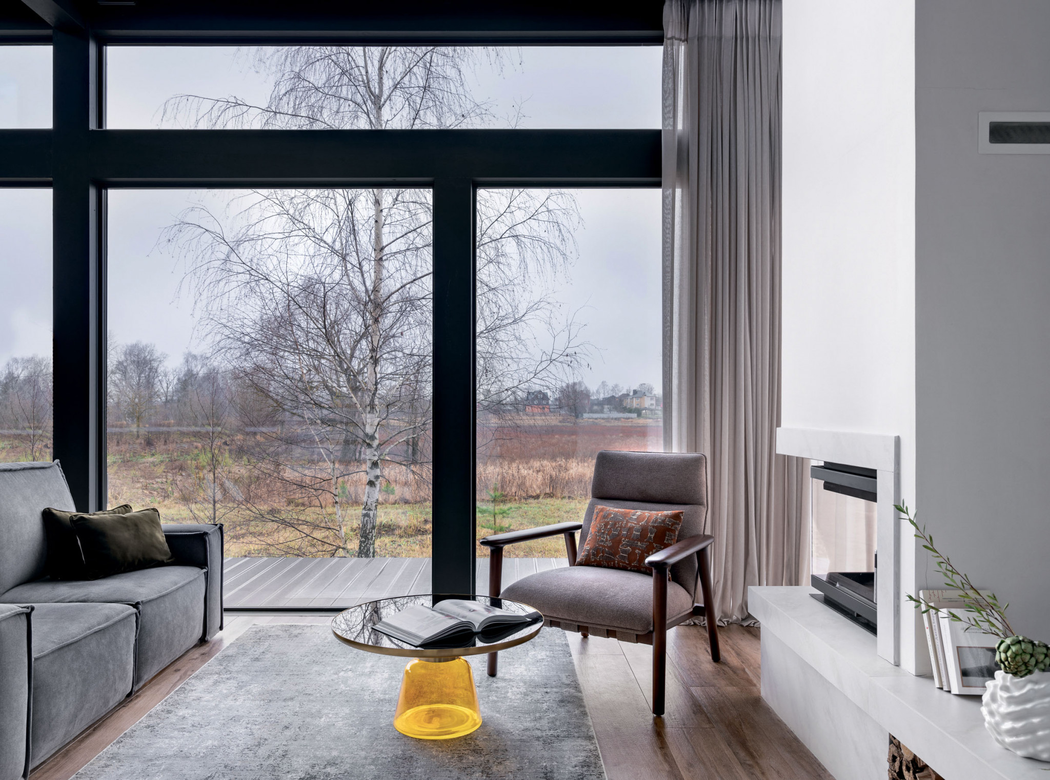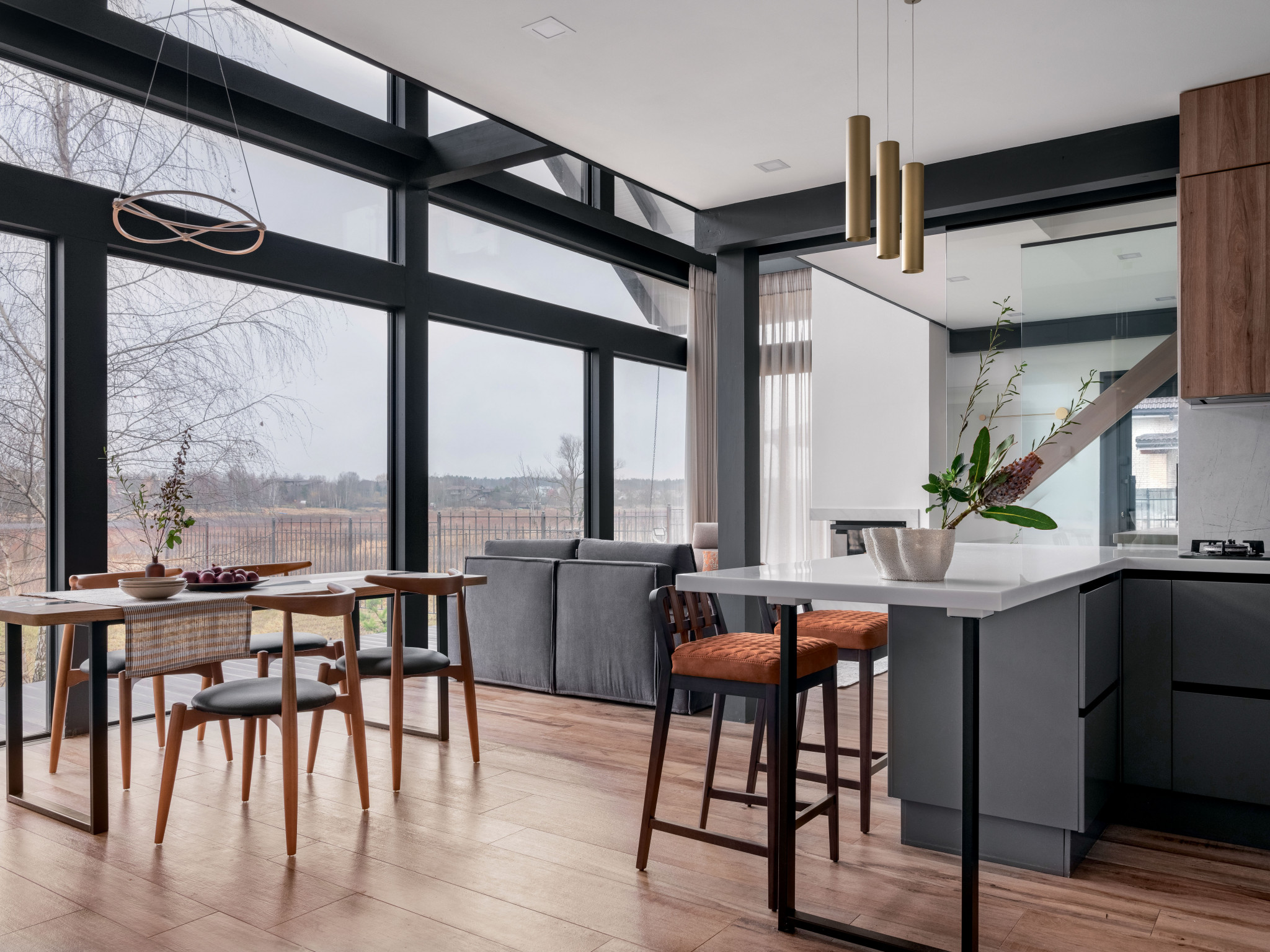 Владельцы дома — взрослая семейная пара. Всю жизнь хозяева жили в городской квартире, однако со временем задумались о собственном доме за городом и построили двухэтажный каркасный дом со сплошным остеклением — его стеклянный фасад развёрнут в сторону будущего озера (временно осушенный водоём скоро снова наполнят водой, и вид обещает быть впечатляющим). Когда коробка уже стояла, хозяева пригласили дизайнера Юлию Панову. Перегружать интерьер лишними деталями не хотели и совместно решили сделать пространство в духе минимализма, чтобы ничего не отвлекало от природы за окнами. Ремонт занял полгода, и за это время пространство кардинально преобразилось: теперь это элегантный, уютный дом, в котором есть всё для отдыха и удалённой работы.