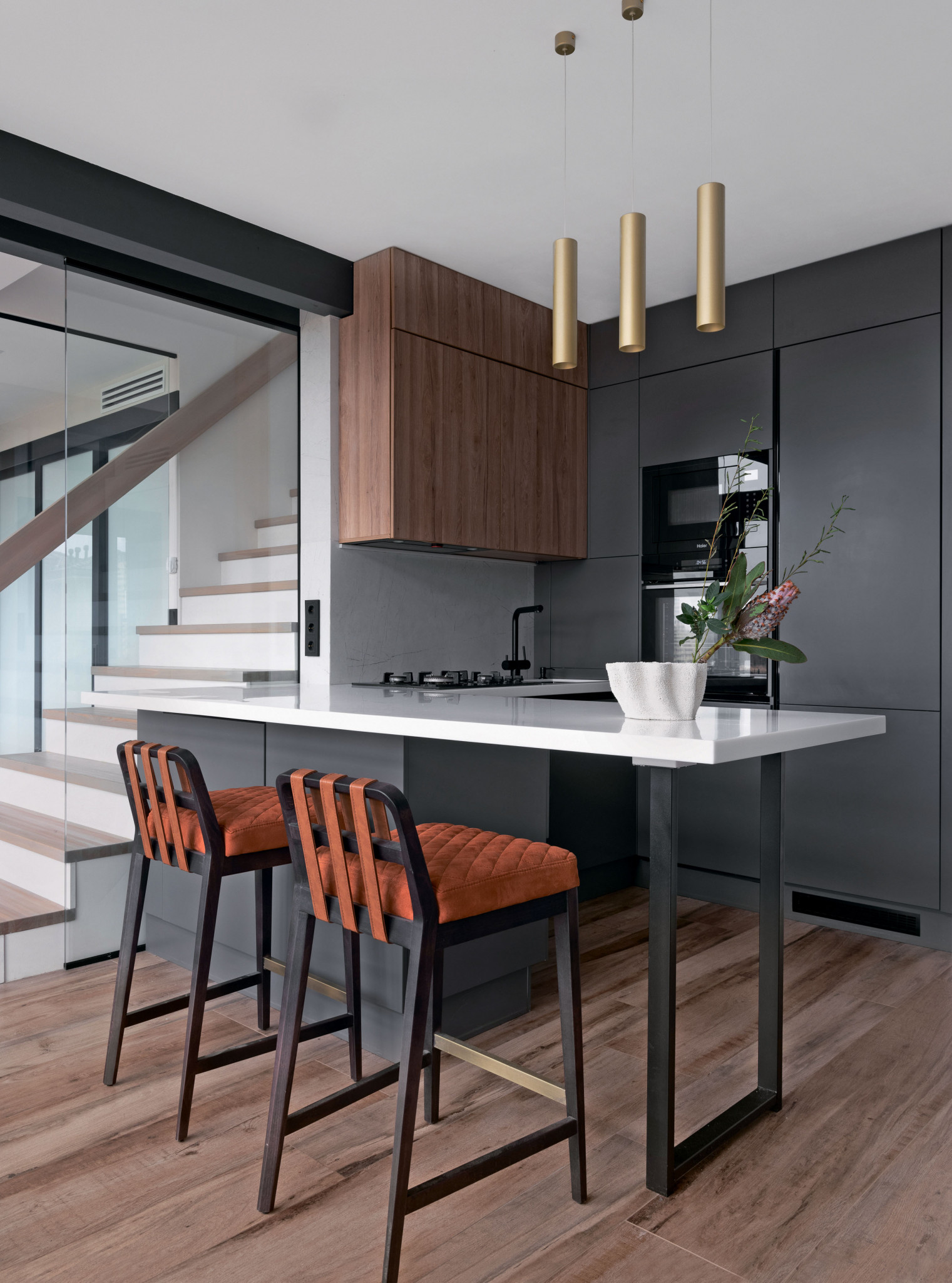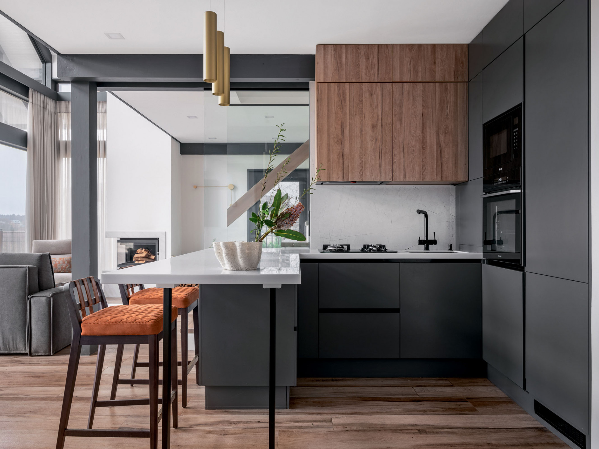 Благородный тёмно-серый цвет матовых фасадов кухни сочетается с графитовым оттенком балок и перил, а оттенок потолка и стен вытащили из палитры керамогранита — это самый светлый оттенок бежевого