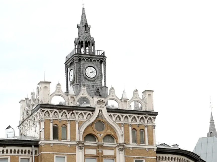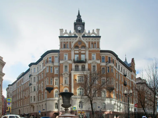 Дом на Сретенском бульваре возвели в стиле эклектики. Он объединил в себе черты модерна и неоренессанса. В состав жилого комплекса вошли два разных по величине корпуса с внутренними дворами. Их соединила ограда из чугуна по эскизу архитектора Оттона фон Дессина. Фасады украсили фигурами мифических существ, людей и животных. Самой высокой частью дома стала стилизованная готическая башня, похожая на Спасскую башню Кремля. Ее оснастили часами и колоколом, который специально для этой цели отлили на заводе Павла Финляндского.