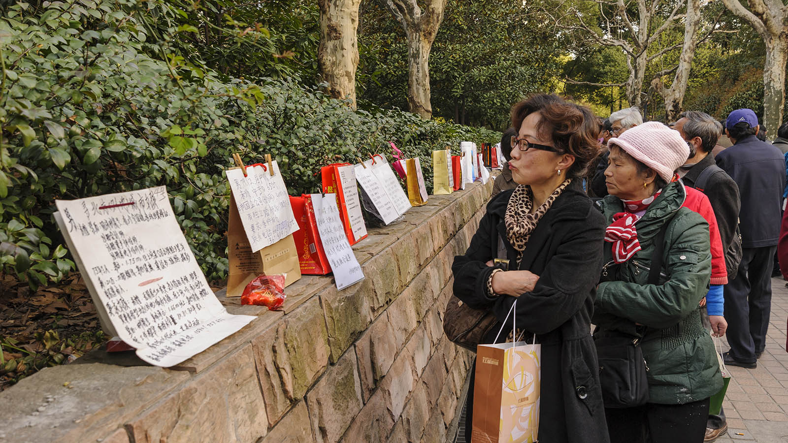 По выходным в Народном парке Шанхая сотни людей встречаются на импровизированном «Брачном рынке». Они держат в руках объявления о поиске пары, прикрепляют их к зонтикам, которые играют роль импровизированных витрин, знакомятся и обмениваются контактами — все это в надежде найти подходящую партию для своих детей.