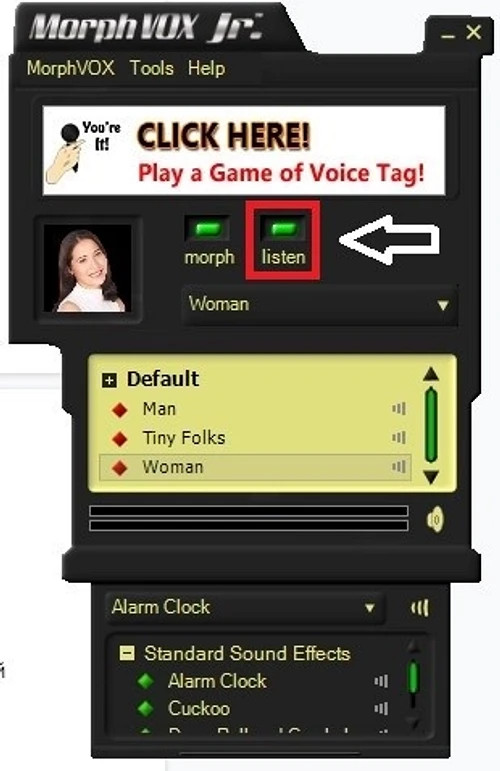 Как пользоваться MorphVOX в Дискорде? Запускаем программу, выбираем нужный шаблон и разговариваем в микрофон. Программа автоматически запускает режим прослушивания микрофона — после смены шаблона вы будете слышать собственную речь. Таким образом легко и интересно подбирать нужную модификацию голоса. Чтобы продолжить разговаривать в Discord и не слышать себя, нужно убрать функцию Listen, кликнув по ней левой кнопкой мыши: