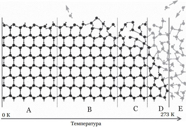 Свойства вещества на поверхности твердого тела не такие, как в его толще. Молекулы поверхностного слоя находятся в особых условиях: им не хватает соседей сверху. Из-за этого меняются свойства целого приповерхностного слоя. В результате в некотором диапазоне температур само кристаллическое тело еще остается твердым, но вблизи границы уже существует квазижидкий приповерхностный слой. Чем ниже температура, чем тоньше этот слой. Но, даже когда его толщина составляет всего одну молекулу, разупорядоченный слой все равно кардинально отличается от упорядоченного кристалла. На рис. 1 на примере льда условно показано, как изменяется поведение поверхности кристалла с ростом температуры от абсолютного нуля и до точки плавления.