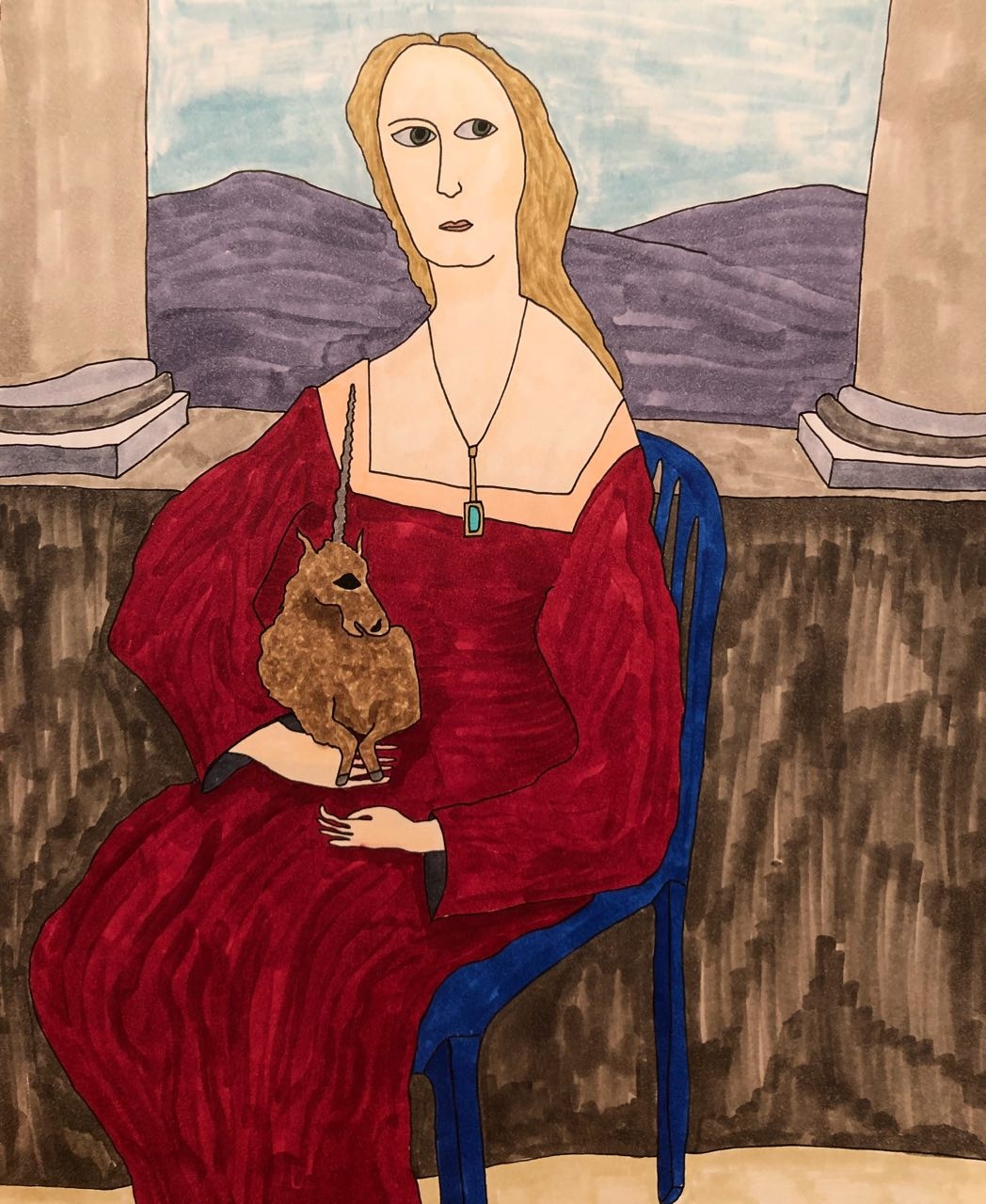 «Ремейк известной картины «Дама с единорогом» Рафаэля Санти. У Рафаэля нарисована целомудренная, благородная, обеспеченная дама, явно продолжающая традиции своей семьи. Она, скучающая, сидит у окна, на фоне озерного пейзажа. На ремейке появляется важная деталь — пластиковый стул, на котором сидит дама. Стул, присущий современности, как символ пластикового ширпотреба. Он выдает нашу даму. Плюс она нарисована