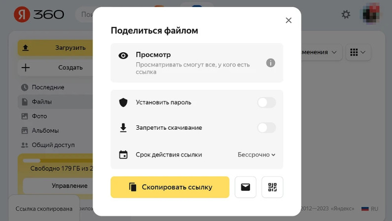Чтобы отправить загруженный документ, надо кликнуть на него ПКМ (или выбрать на смартфоне) и нажать “Поделиться”. Настройте параметры доступа и скопируйте ссылку - по ней получатель сможет просмотреть или скачать файл.
