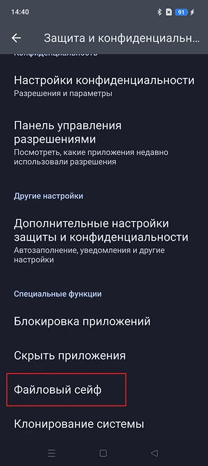 - Найдите раздел «Специальные функции», а там пункт «Файловый сейф».