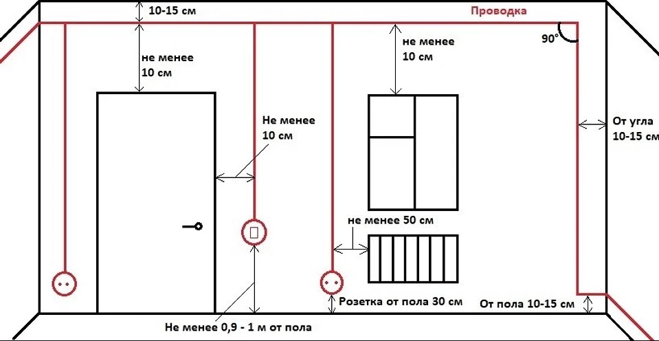 - Провод в стене должен лежать строго горизонтально или вертикально относительно пола. Не допускается пускать его по кривой или какой-либо другой траектории.