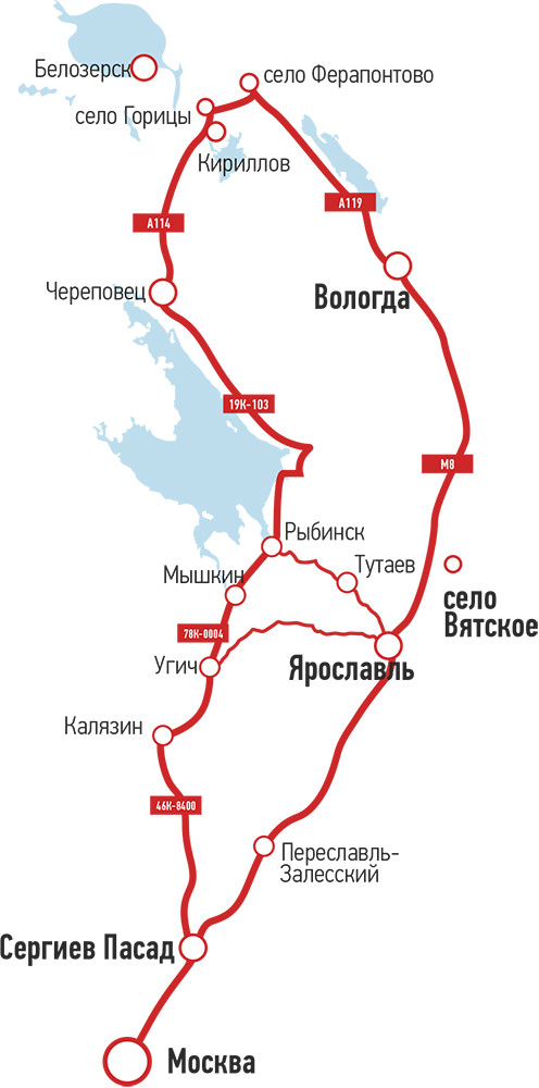 В эти три славных городка – навстречу мрачной церкви убиенного царевича Димитрия на Крови, Музею мыши и затопленной колокольне на Волге – можно отправиться не только из Сергиева Посада, но и из Ярославля в обратном направлении. Подробнее об этом маршруте читайте в разделе «Сергиев Посад».