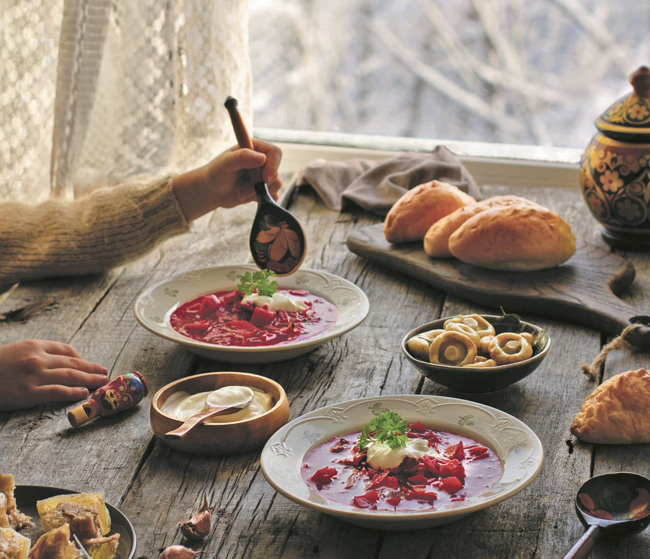 И наконец, борщок – под этим словом имеют в виду подкрашенный свеклой консоме; чаще всего подается в ресторанах с острыми гренками.