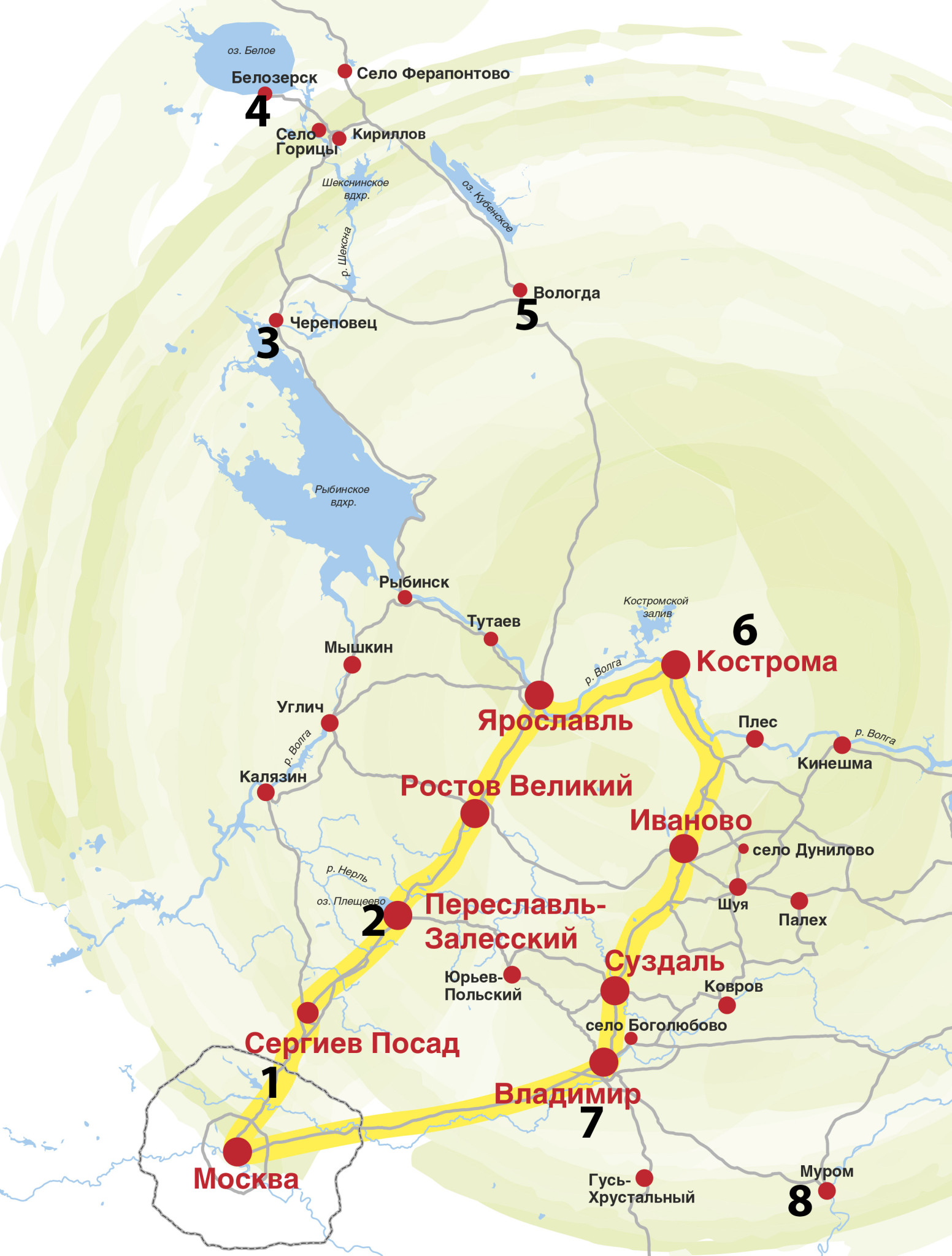 Символический золотой круг образуют восемь древнерусских городов, расположенных к северо-востоку от Москвы. Во всех сохранились уникальные памятники истории, центры народных ремесел, другие коды нашей национальной идентичности, при этом каждый уникален еще и в чем-то своем. Сергиев Посад с Троице-Сергиевой лаврой – духовный центр России. Переславль-Залесский – родина князя Александра Невского. Ростов Великий – как пестроцветная шкатулка, вышедшая из рук финифтянщика. Ярославль – град на Волге с тысячелетней историей, белокаменными храмами и ожившими легендами. Кострома – это красивейшие пейзажи и святые места. Иваново – город с «женским лицом» и место, где зарождались революционные идеи. Суздаль – единственный в стране город-музей с памятниками деревянного зодчества. И наконец Владимир, где сохранилось множество памятников домонгольской Руси, фрески Андрея Рублева и где очень любят вишню. А еще есть Малое Золотое кольцо (оно же Серебряное), к которому относят Боголюбово, Муром, Плёс, Углич, Калязин, Юрьев-Польский, Палех и другие городки (их количество в разных источниках варьируется).